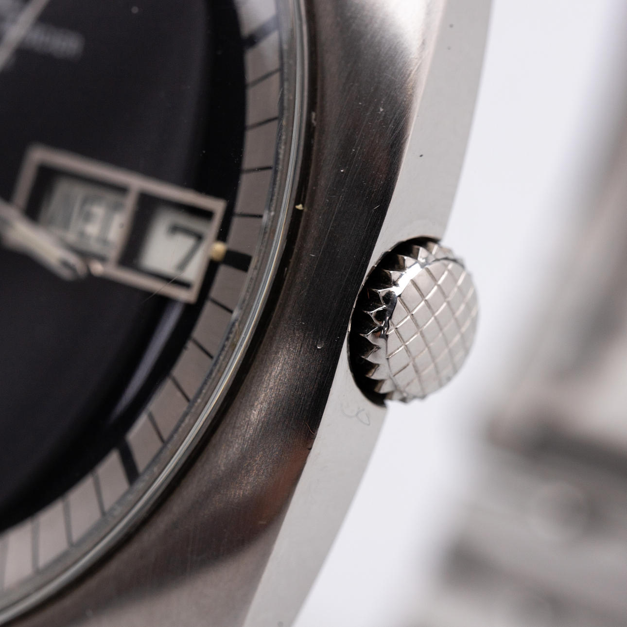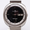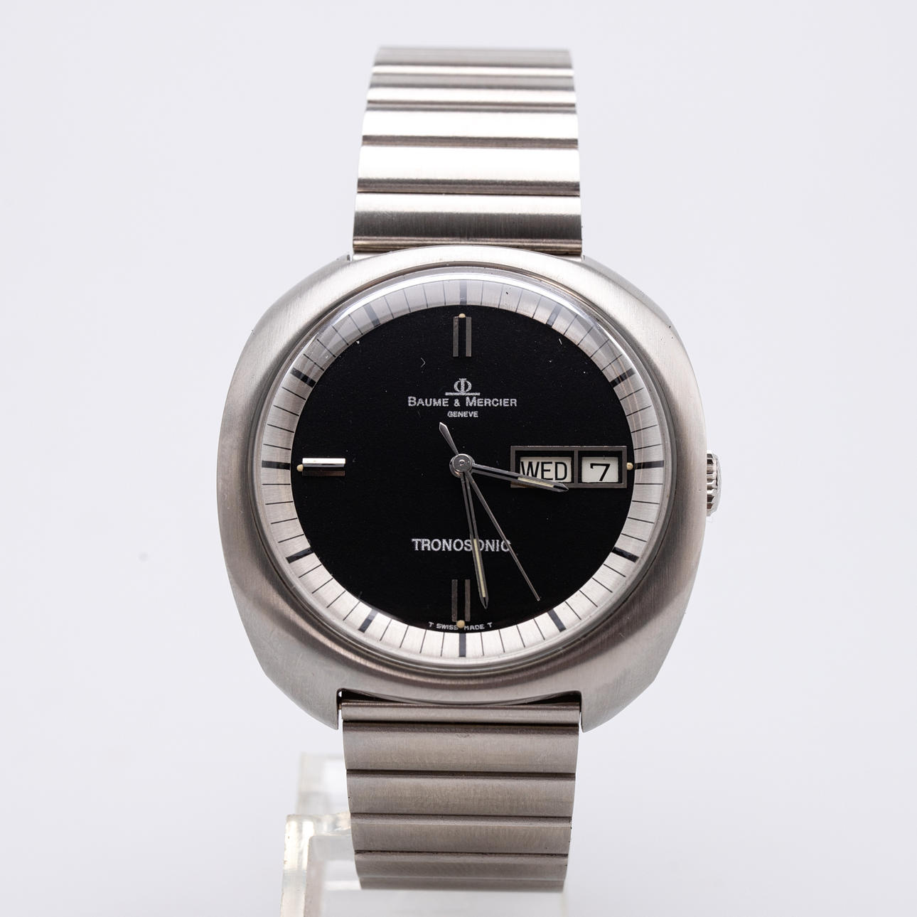 Baume & Mercier Armbanduhr, Modell 'Tronosonic Jumbo' ref. 5107. Gehäuse und Gliederarmband aus Edelstahl, schwarzes Zifferblatt mit Tag- und Datumsanzeige bei '3', Quartz Uhrwerk, Kunststoffglas. Maße Gehäuse ca. 41 mm. Zum Zeitpunkt der Begutachtung lief die Uhr, Auctionet.com garantiert nicht für die Funktionalität.