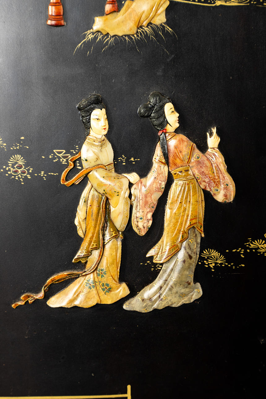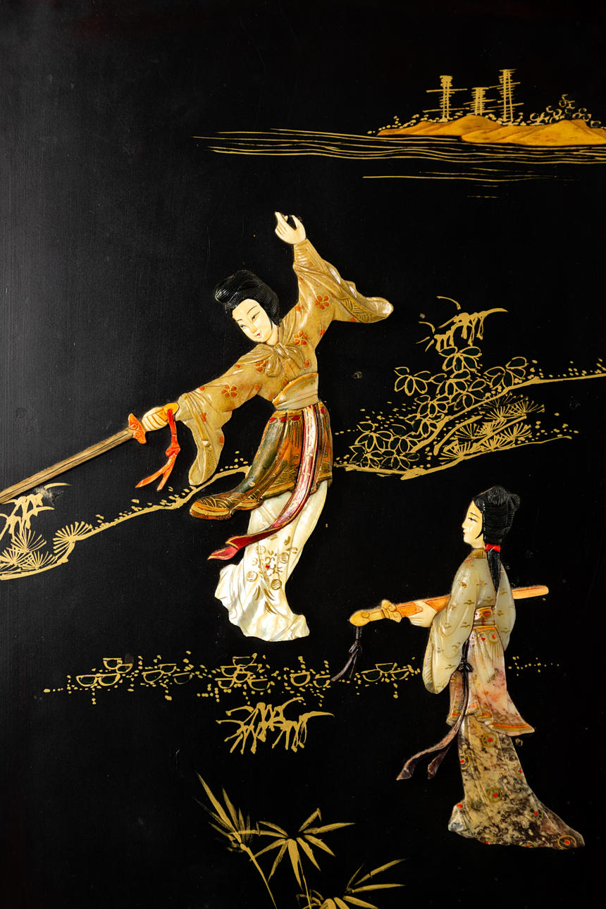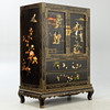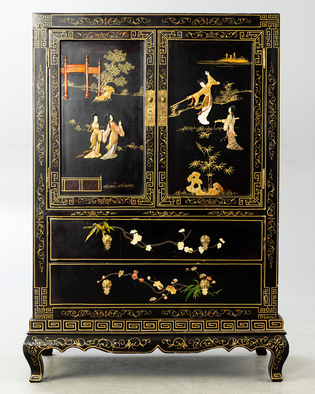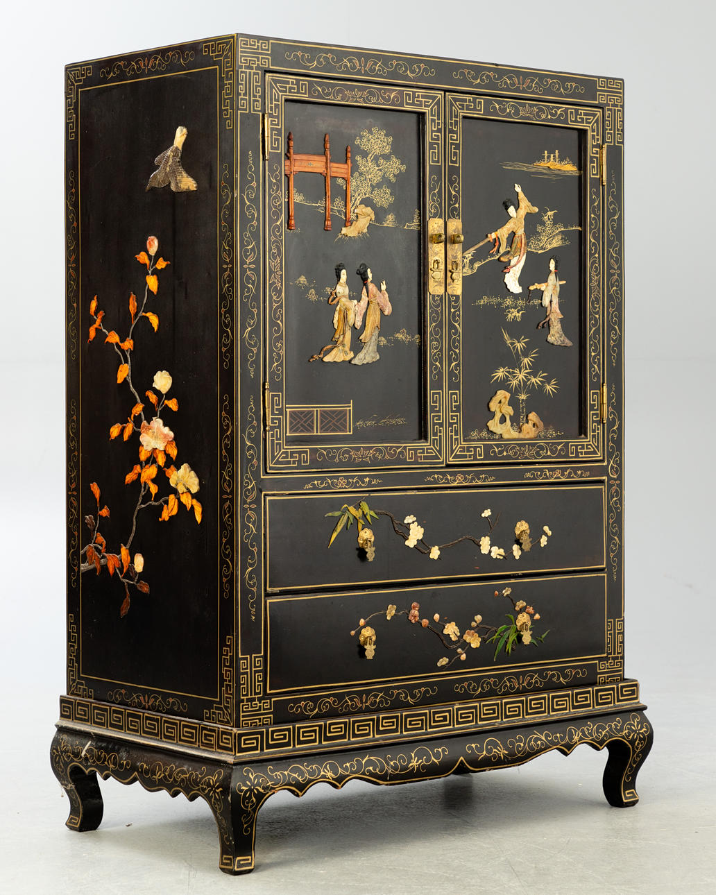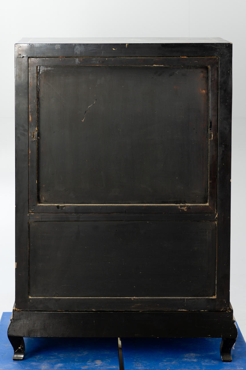 Holz, allumfassend schwarz lackiert mit farbigem Speckstein, Perlmutt und Bein dekoriert. Blumen u. Vögel, Hofdamen im Garten. Messingapplikationen. Gerader Korpus auf S-förmigen Füßen mit geschweifter Zarge, gegliedert 2 Türen und 2 Schubladen. HxBxT: ca. 122 x 88 x 45,5 cm.