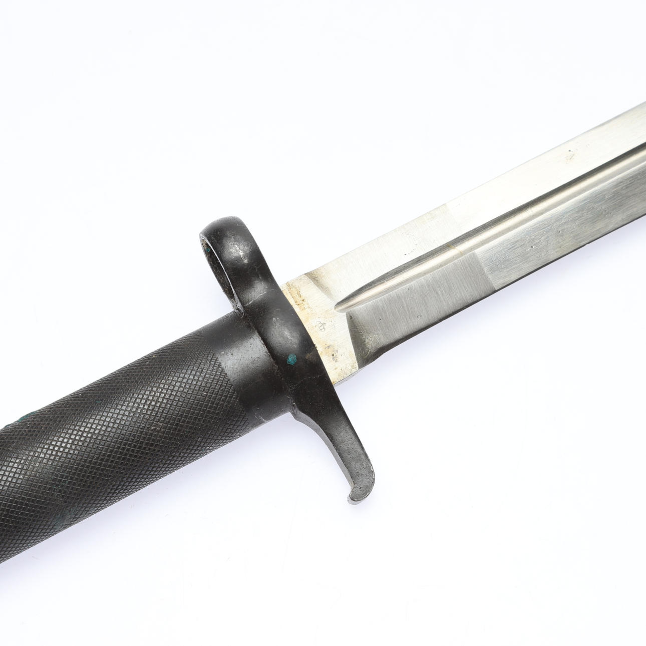 Mauser-Bajonett. Mit der sicheren Eskilstuna Jernfabrik AB. Mit Stahlwanne und Trägerleder. Länge ca. 33 cm.