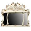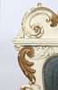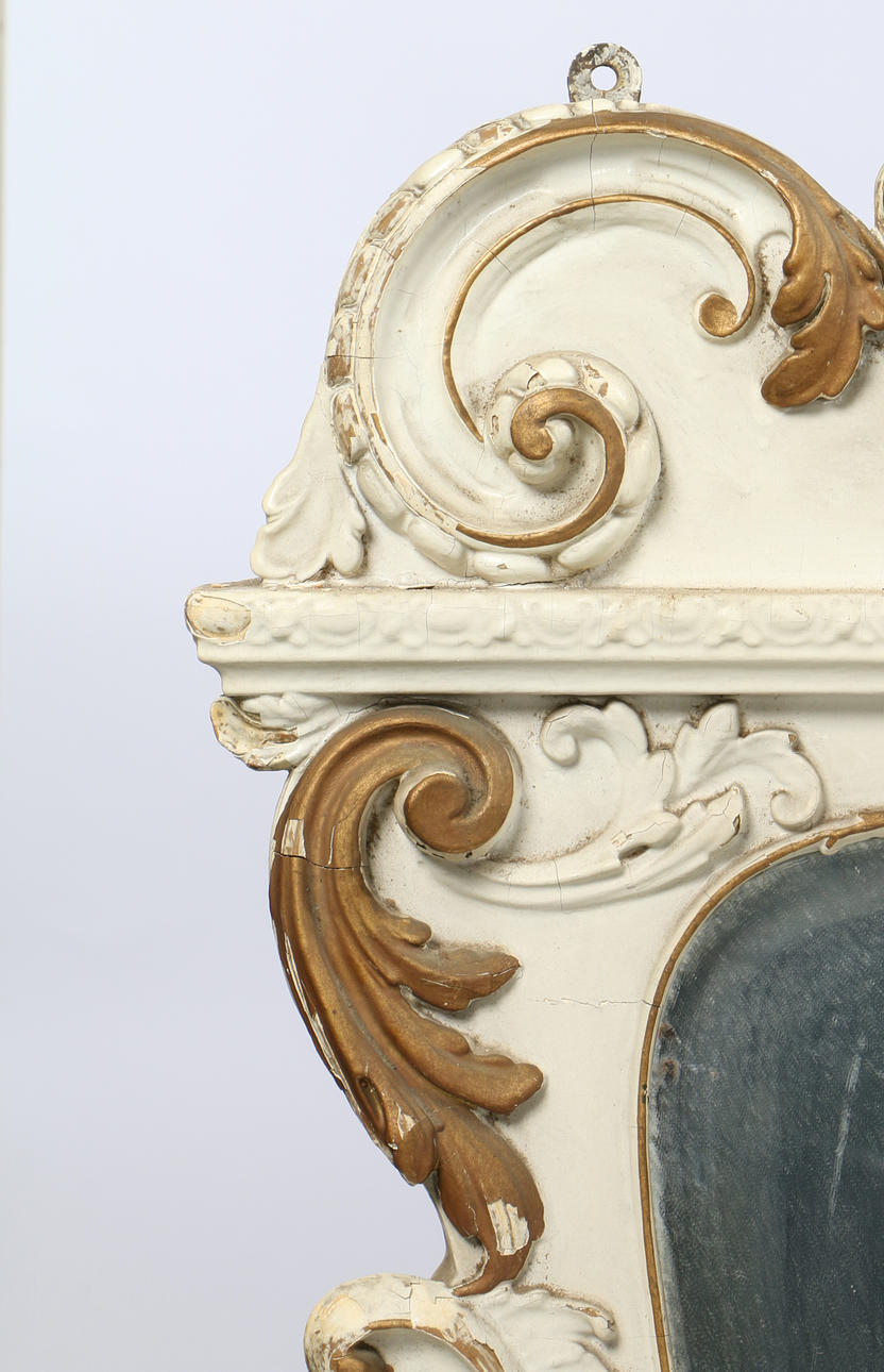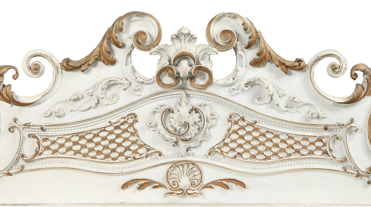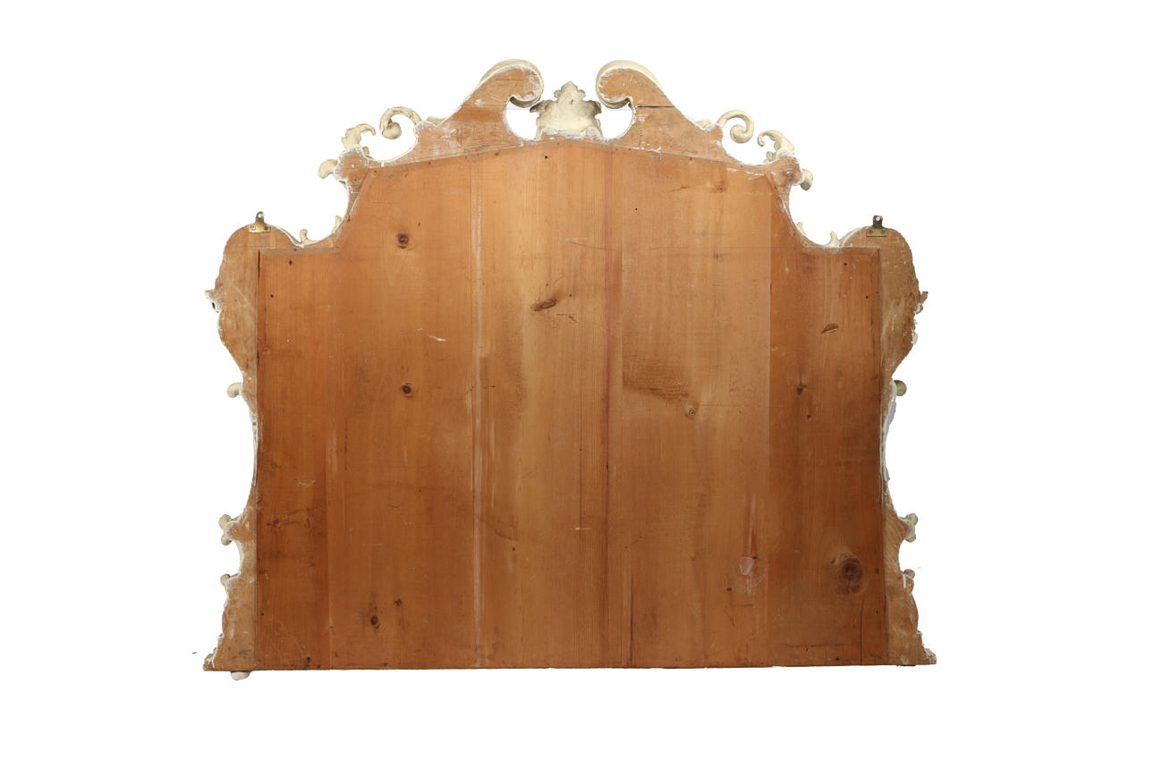 Ein viktorianisch bemalter Übermantelspiegel, weiß mit goldenen Akzenten bemalt und mit einem Rollgiebel über einem Regal über drei Spiegelplatten mit Rollkanten, 142 cm breit und 155 cm hoch.