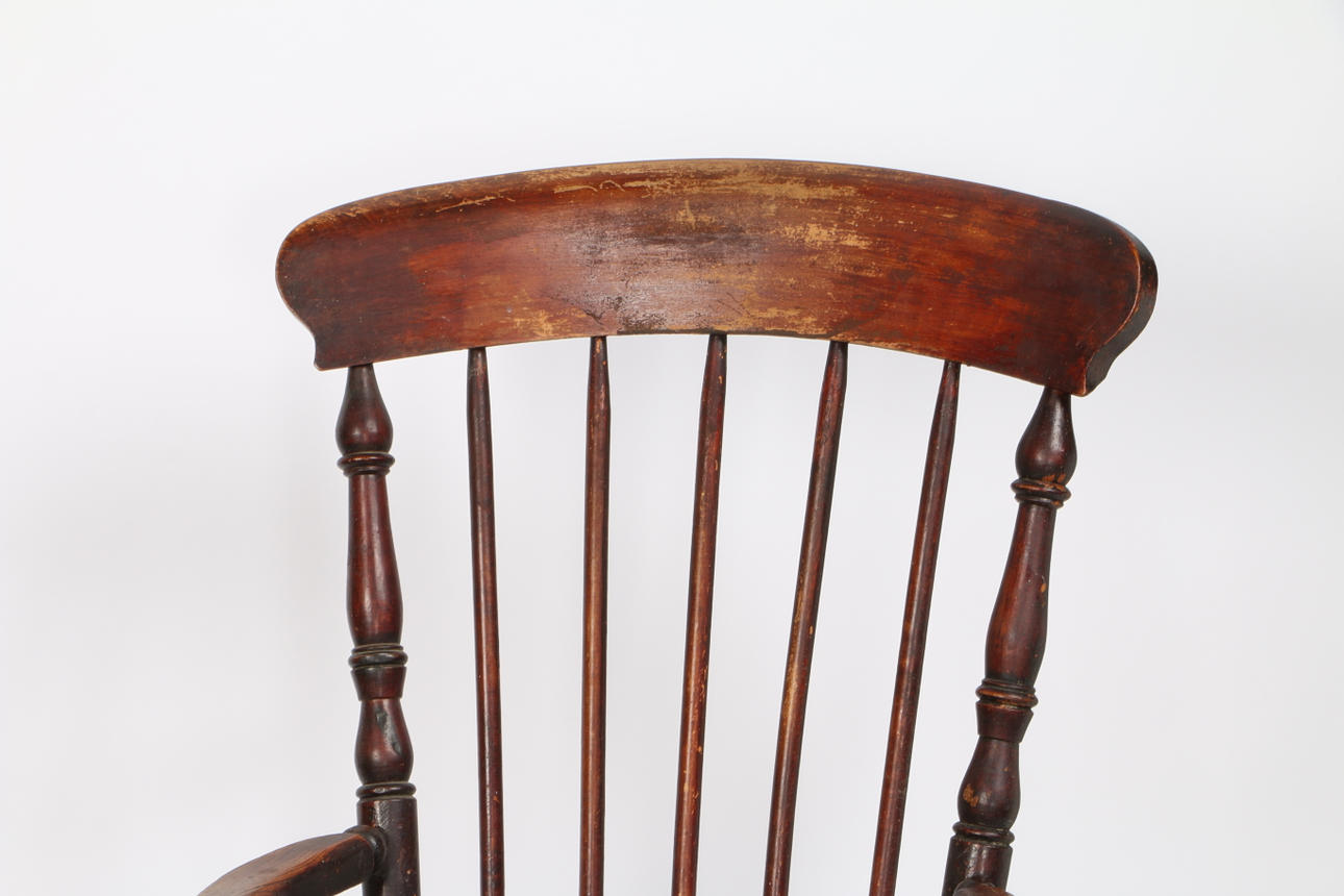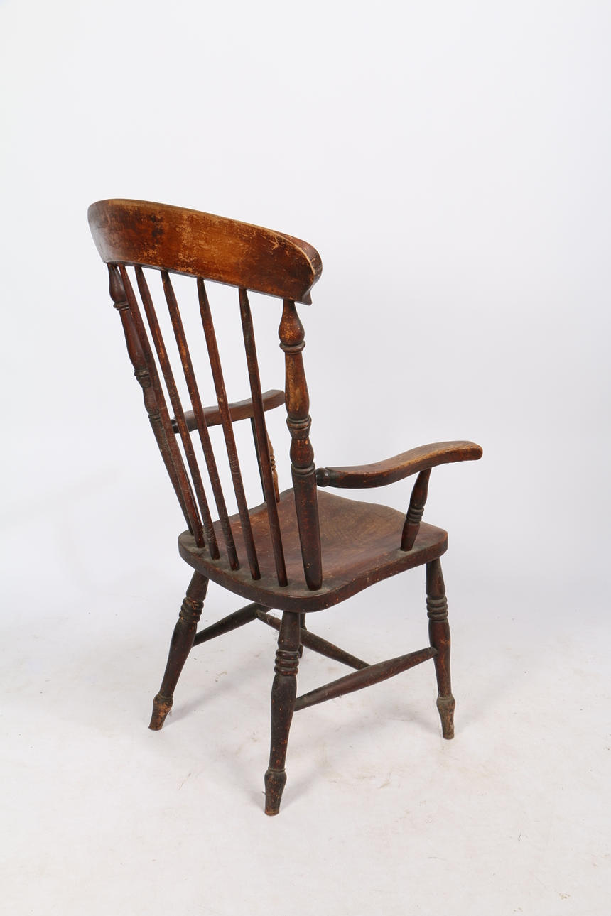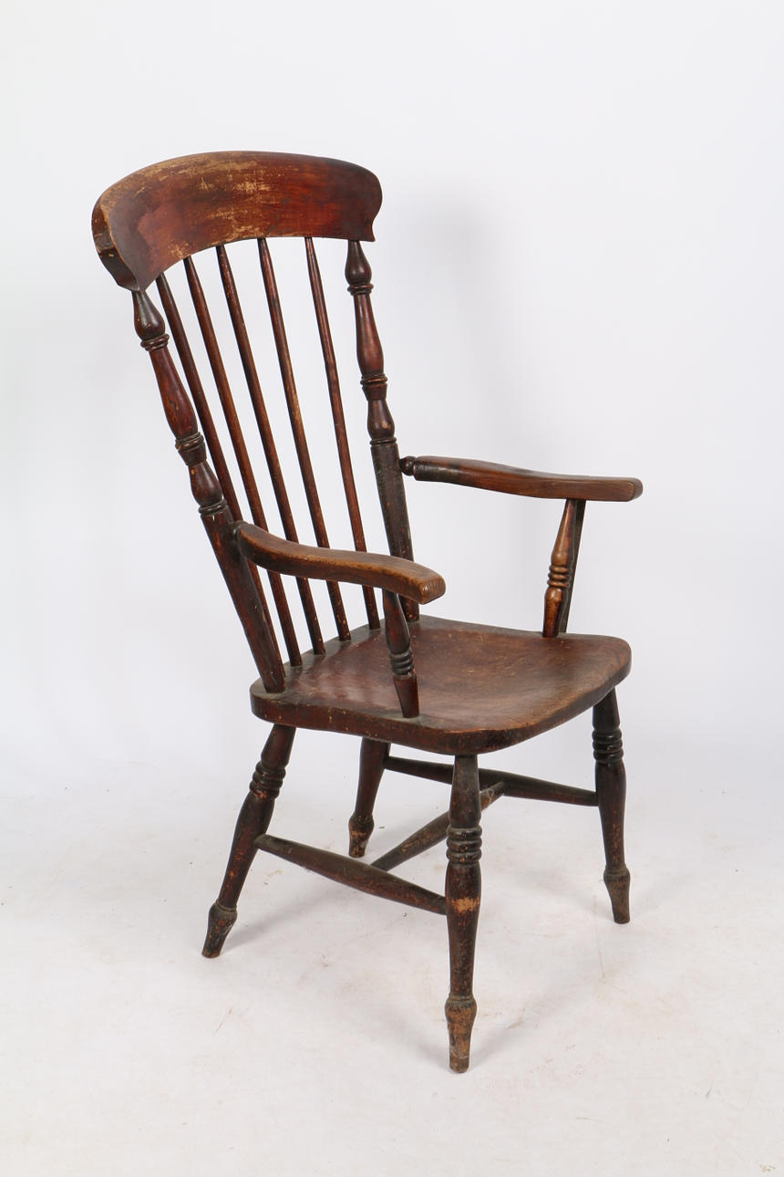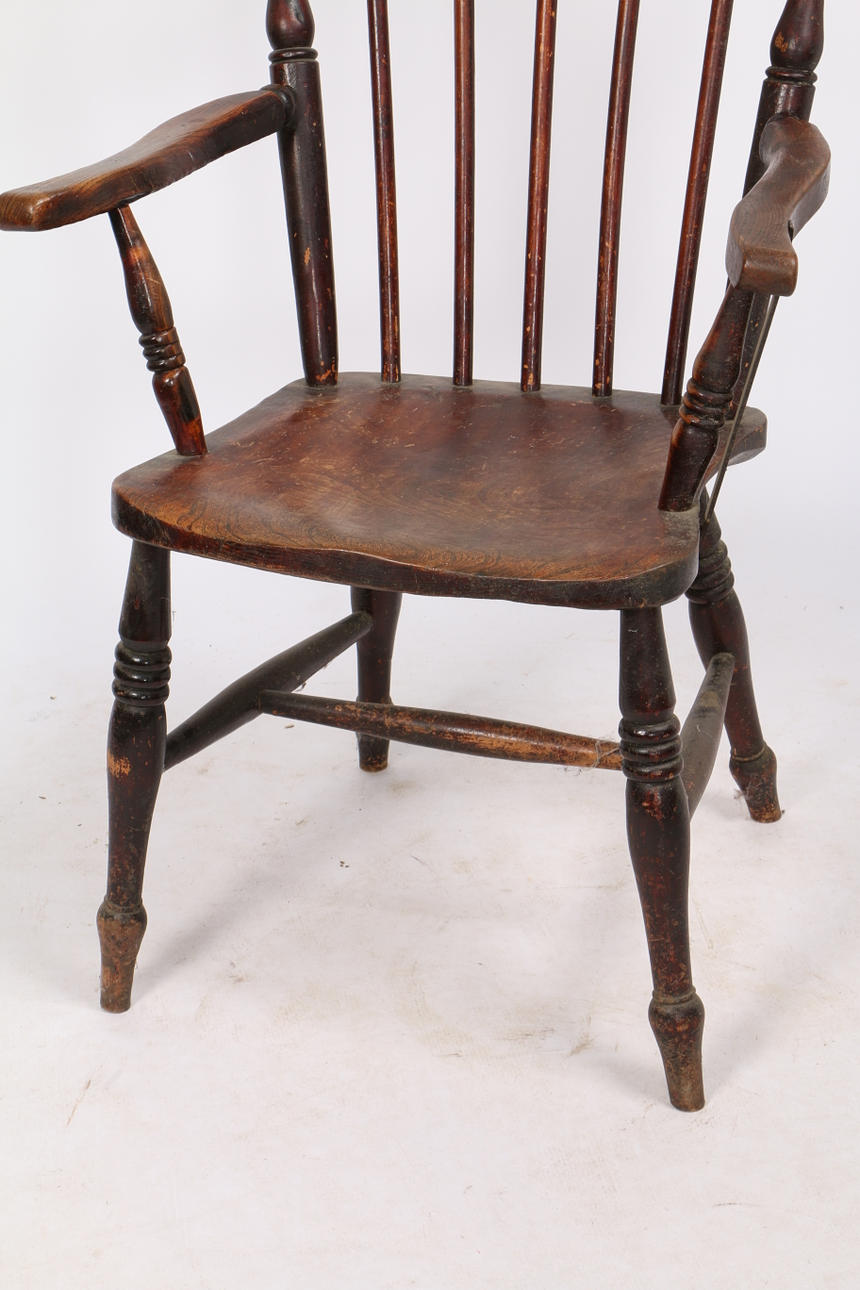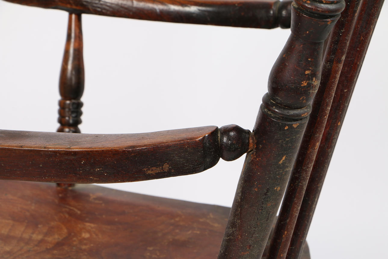 Mit geformten Ellbogenstützen, massiver Ulmen-Sattelsitz, Spindelbeine, die durch Bahren verbunden sind, 111 cm hoch, 59,5 cm breit.