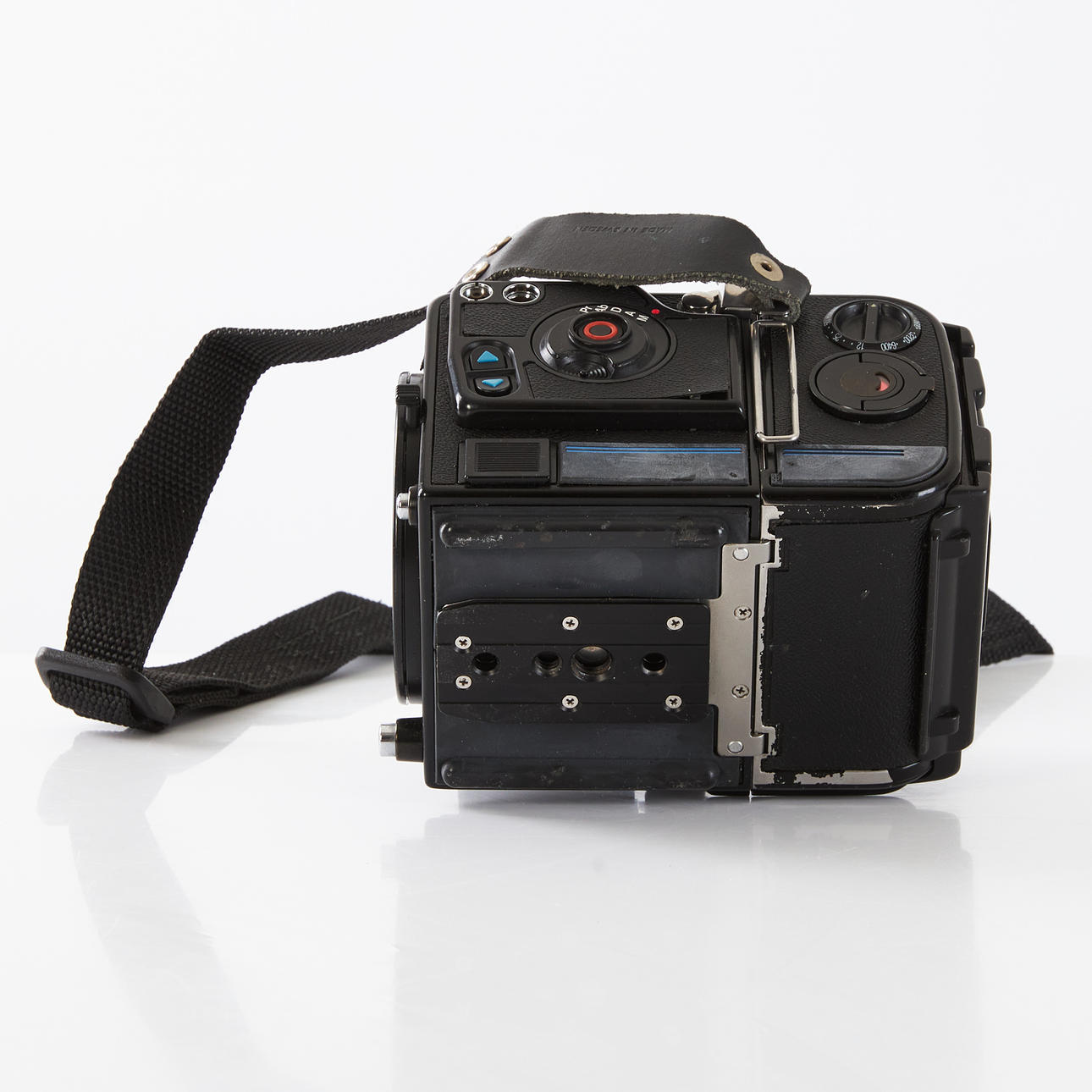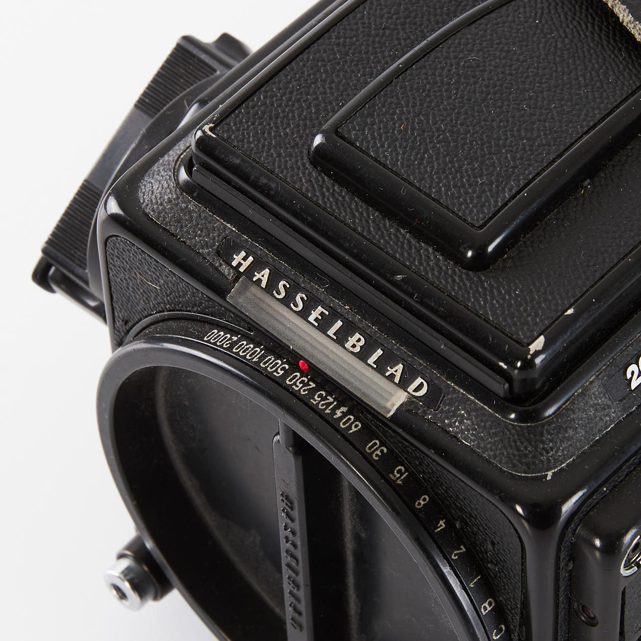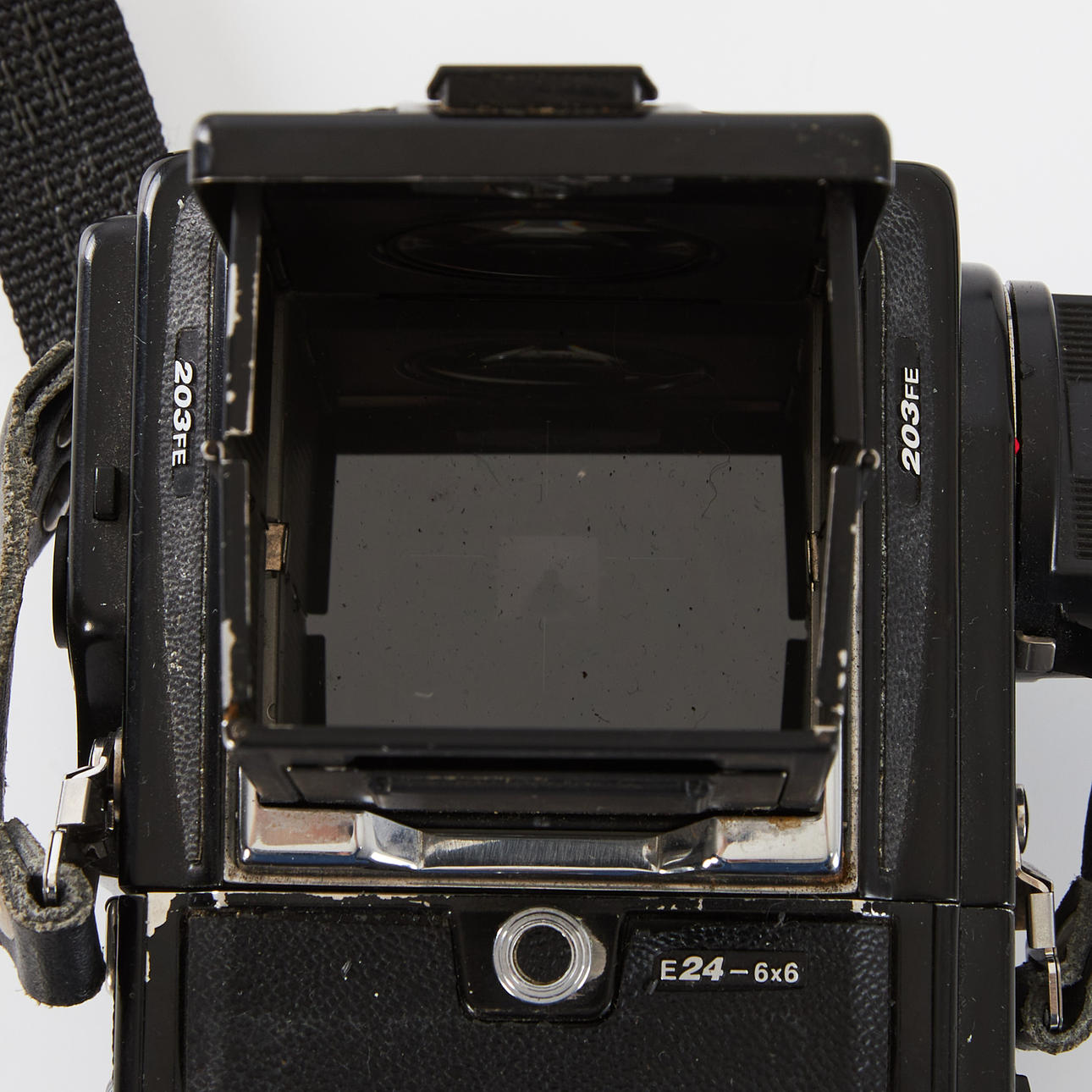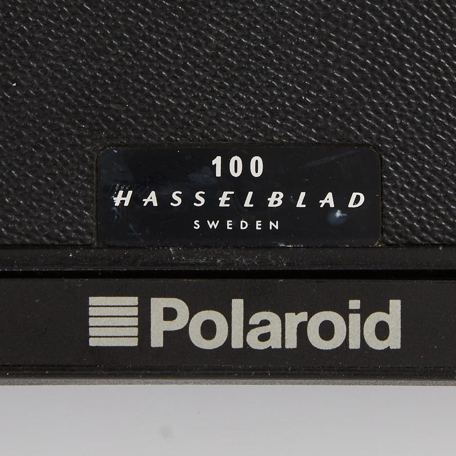 HASSELBLAD 203FE (18EE10611), Schornsteinfeger, Kurbelmaschine (RR 493334), Rückseite E24 - 6x6 (38ER10045), Polaroid-Rückwand 100 (RU3711983), Lupe mit Fokussierhaube, -1 Dioptrie (42374) und Kameragurt.