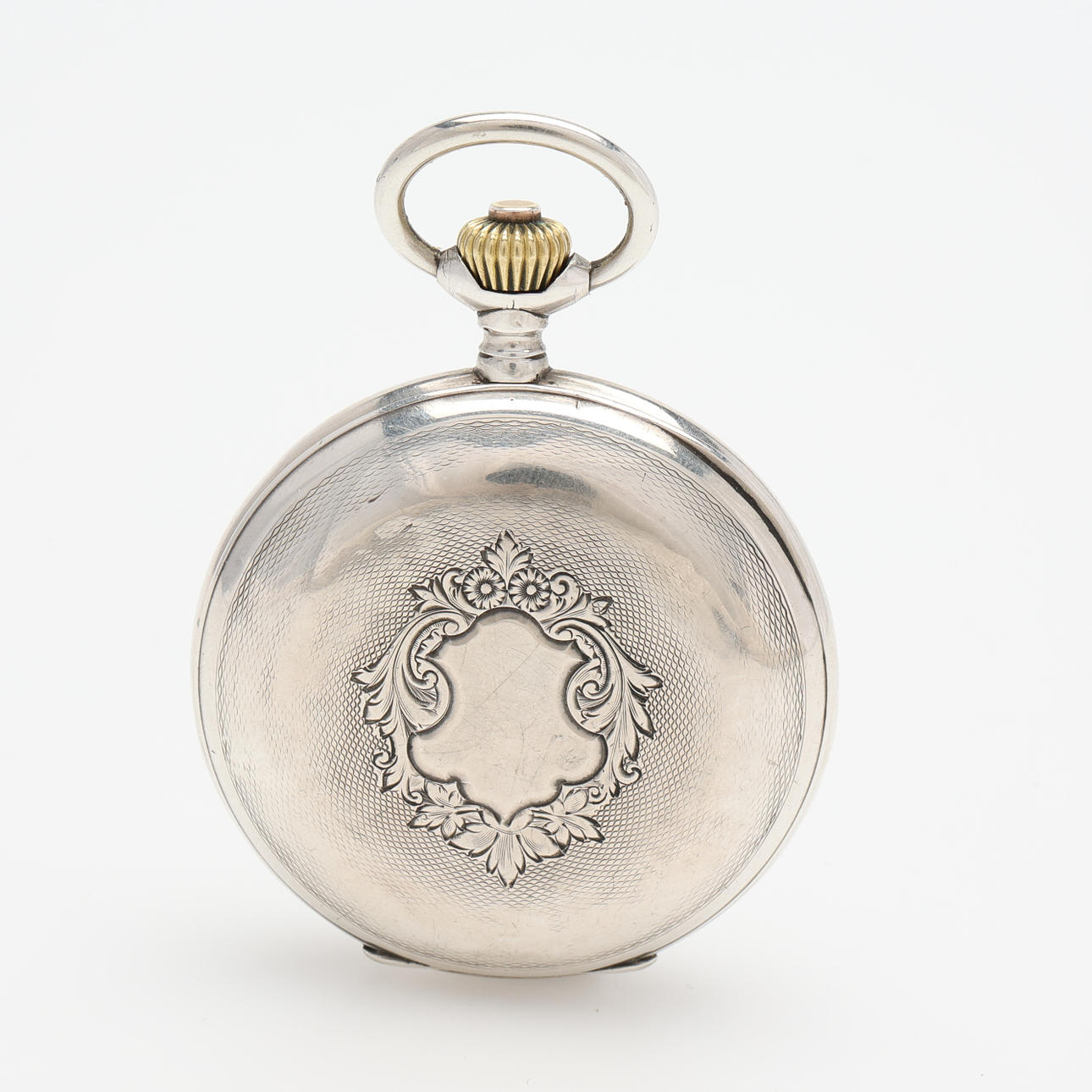 Silbernes Gehäuse, Gehäusenummer 3955098. Durchmesser 55 mm. Inklusive Etui aus Eichenholz.