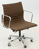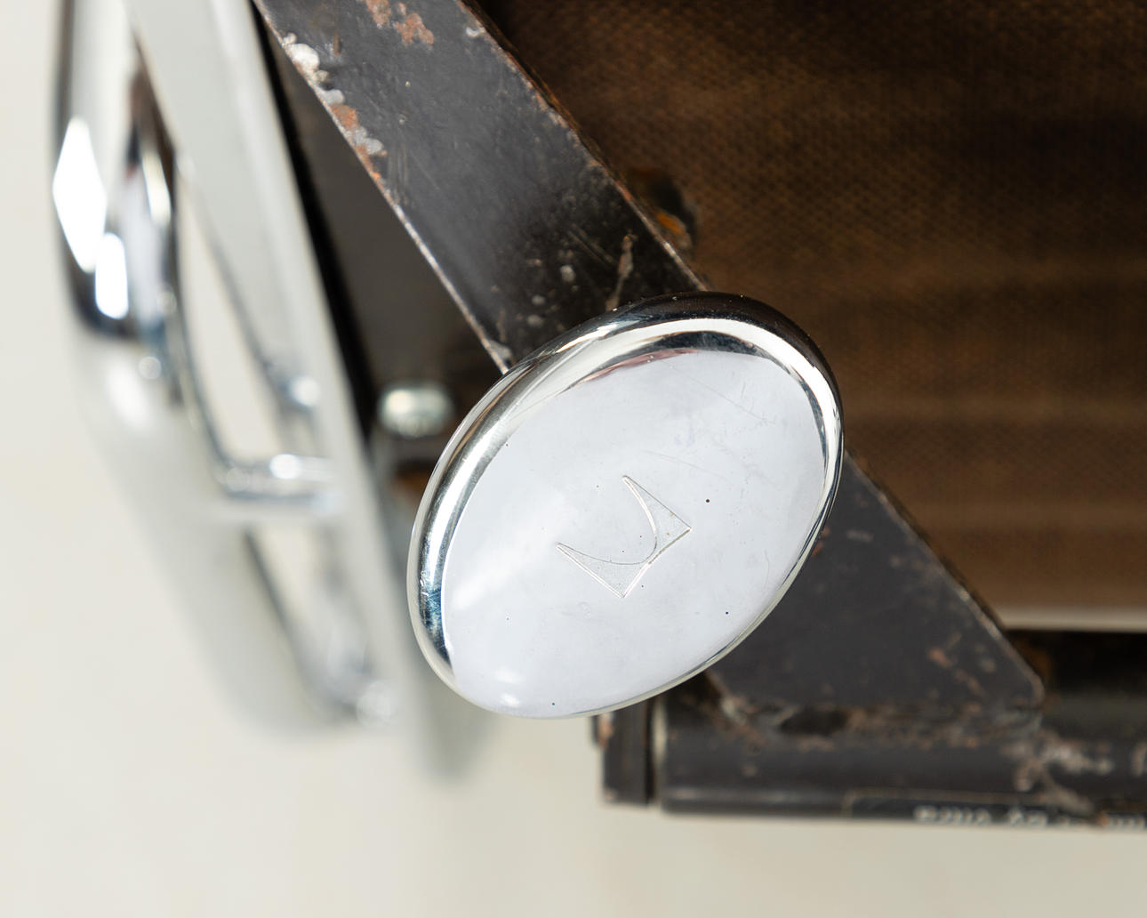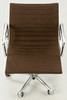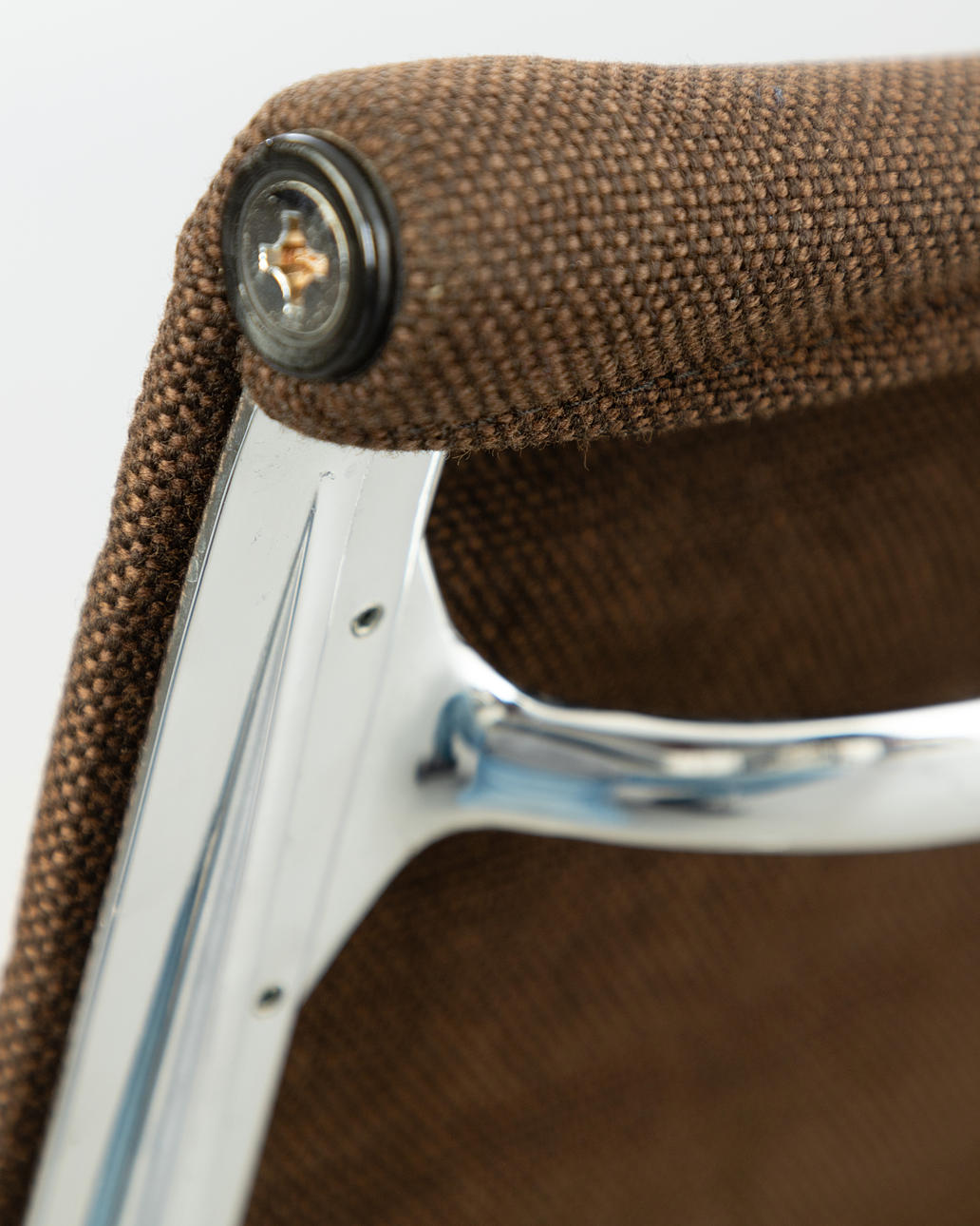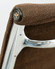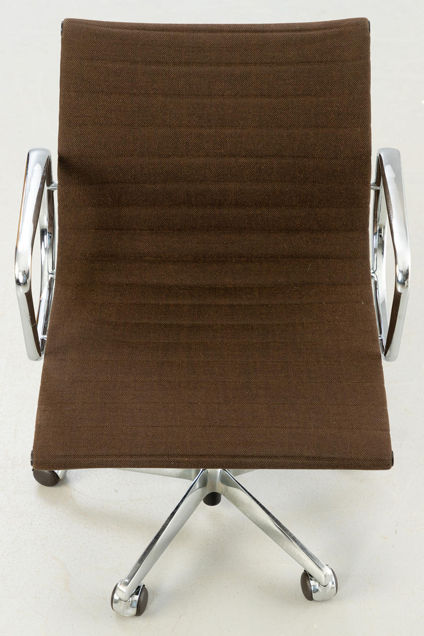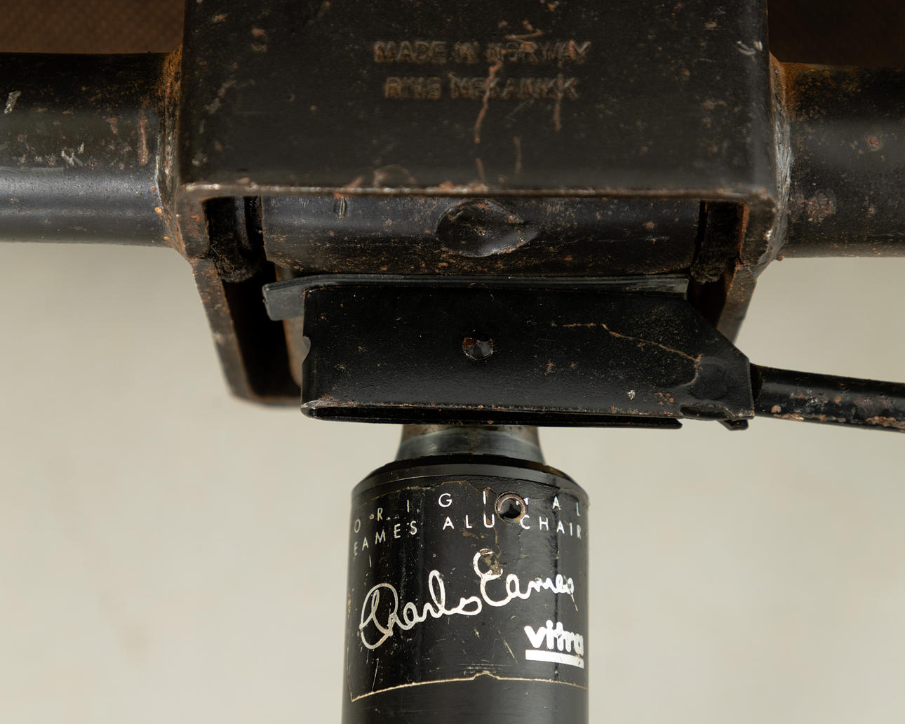Entwurf: 1958. Drehbar, mit Rollen, höhenverstellbar, Wippfunktion. Aluminium, verchromt, braunes Hopsak. Der Sitz wurde nachträglich auf einem früheren Herman Miller Untergestell montiert. Die Gasfederung nachträglich aus einem früheren Modell montiert.