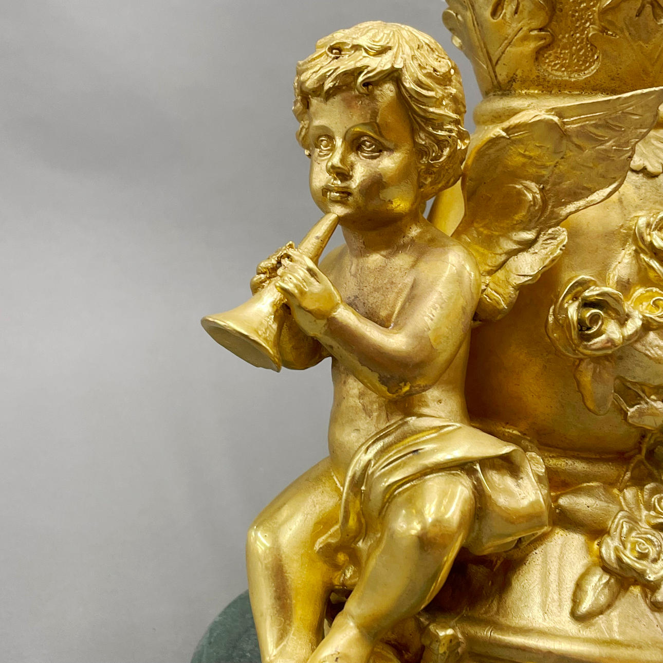 Großer Engel aus vergoldeter Bronze, Marmor und Glas, H. 28 cm, Durchm. 32 cm.