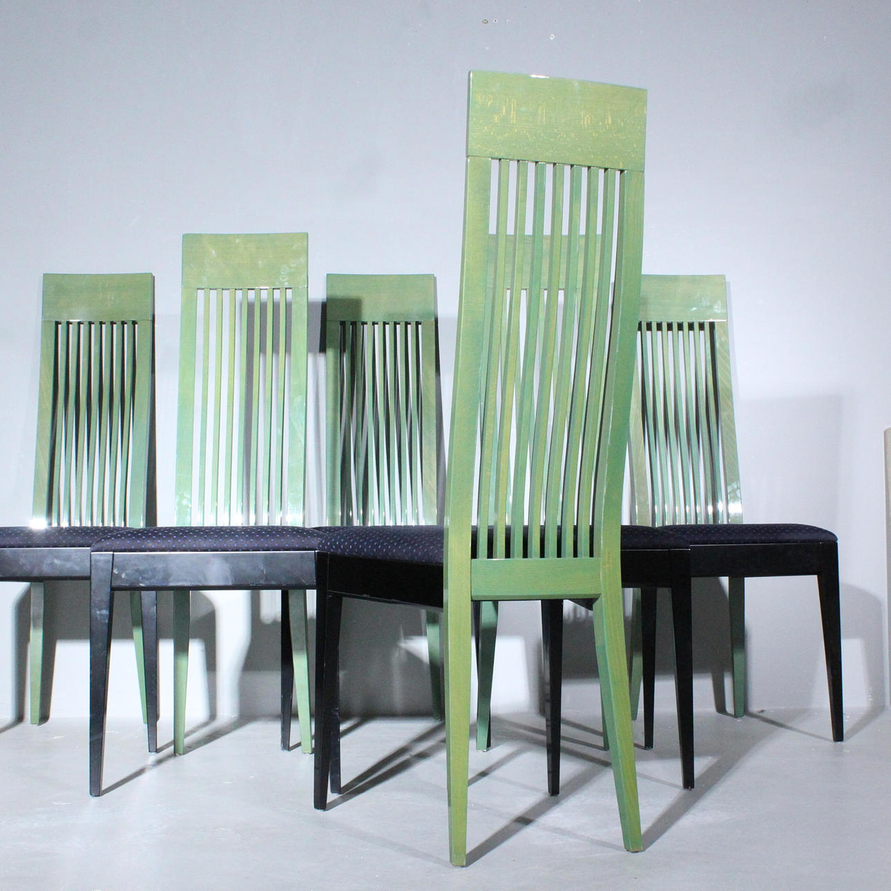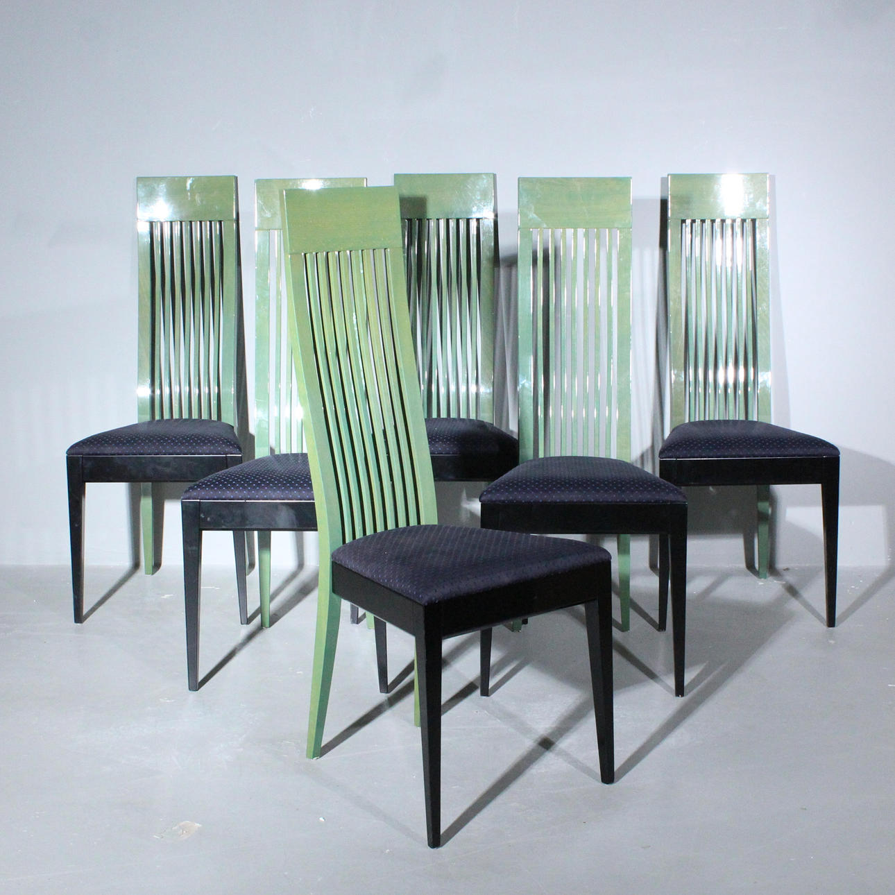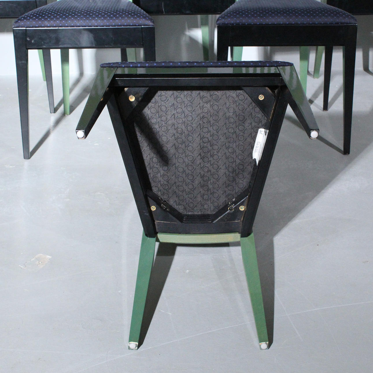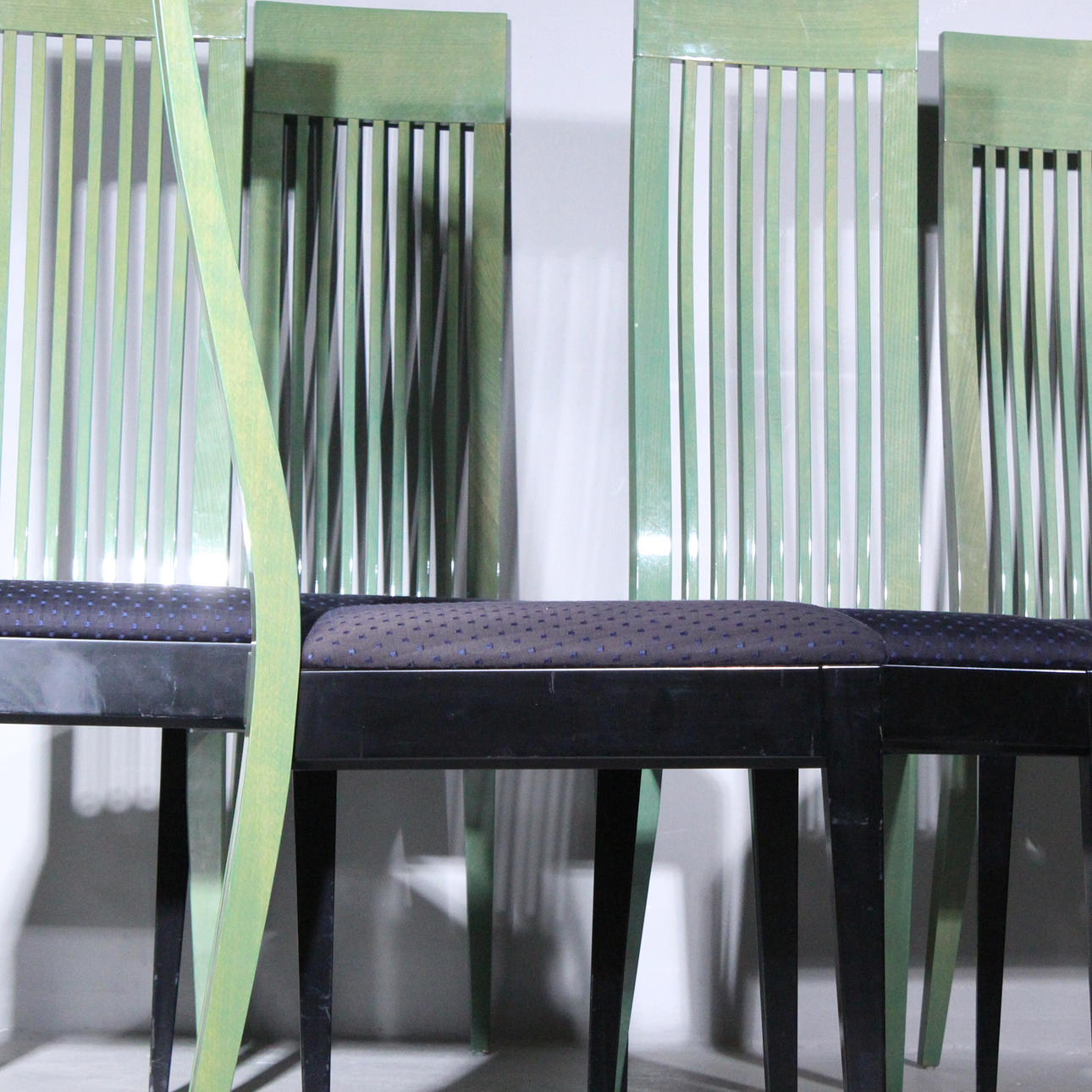 Tonon, Italien, sechs Stühle / Esszimmerstühle, Holz, grün lackiert, aufgepolsterte Sitzflächen, unterseitig mit Herstelleretikett versehen,