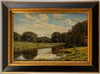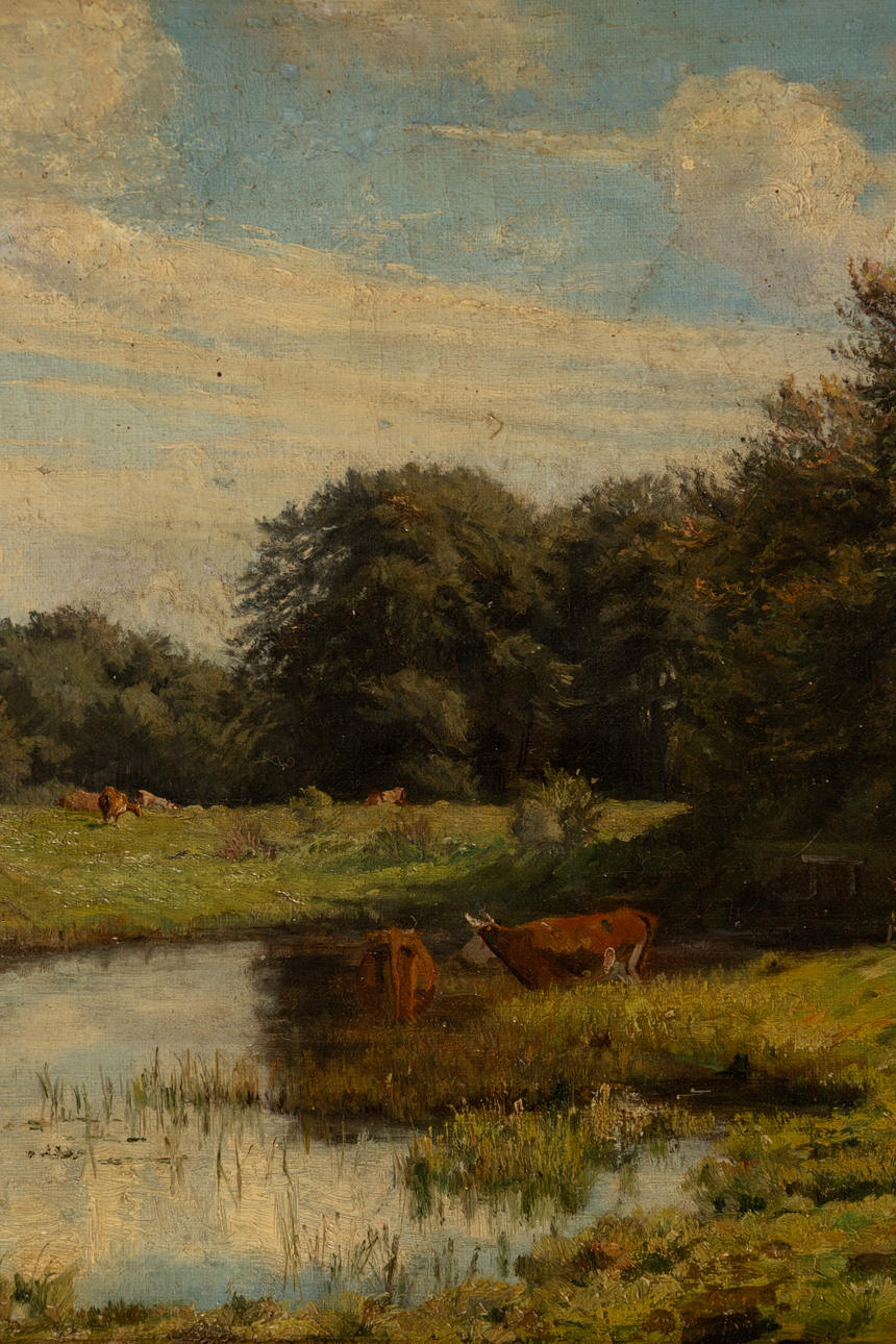 Landschaftsmaler 19. Jahrhundert, Landschaft mit Kühen, Öl auf Leinwand, 1883, monogrammiert und datiert rechts unten 'MK 83', ca. 36 x 54 cm, mit Rahmen ca. 52 x 72 cm.