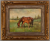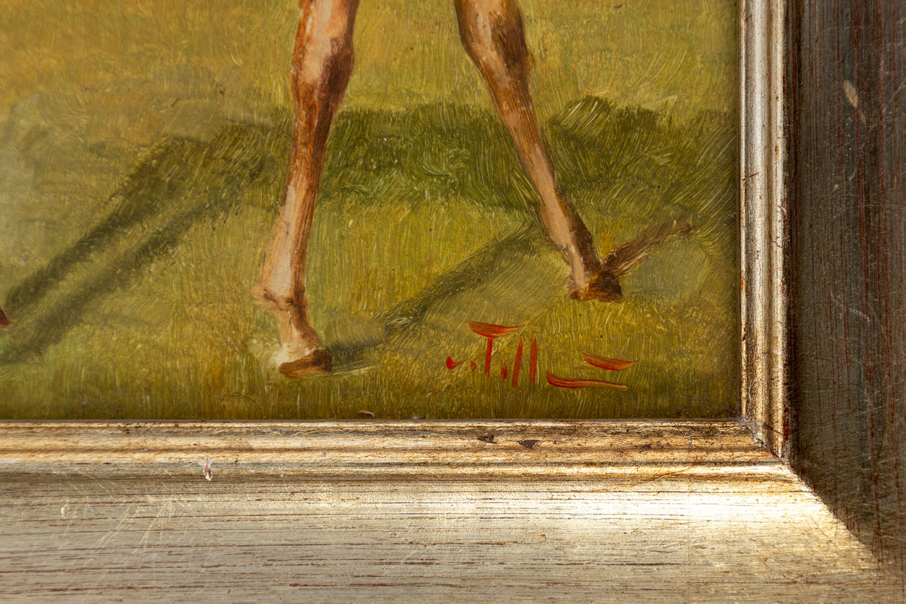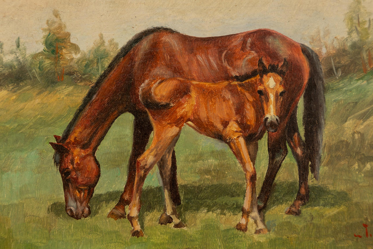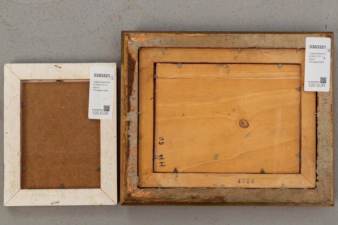 2 kleine Gemälde: Pferde, Öl auf Holz bzw. Öl auf Hartfaserplatte, beide schlecht leserlich signiert, ca. 18 x 24 und 18 x 13 cm, mit Rahmen bis ca. 35 x 29 cm.