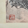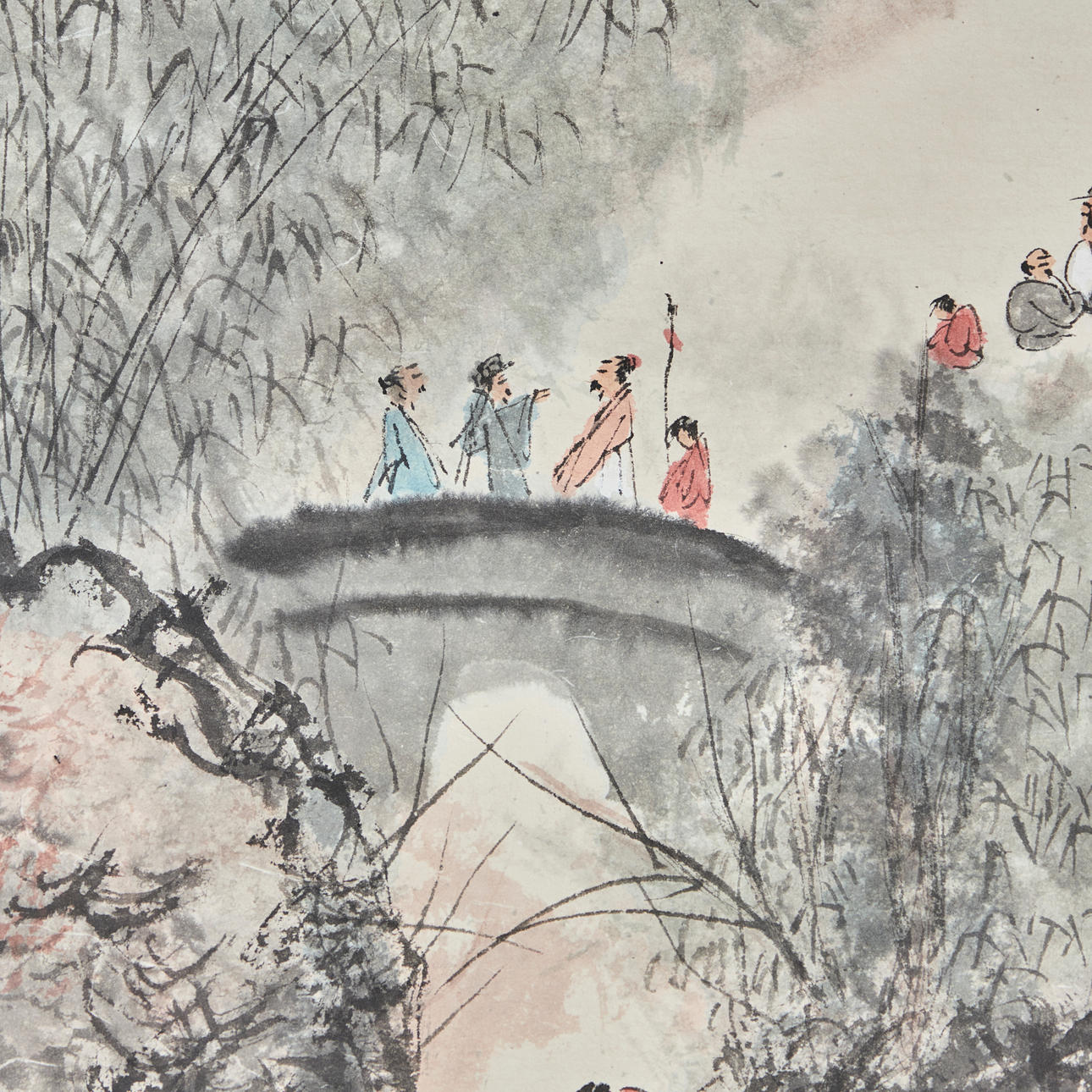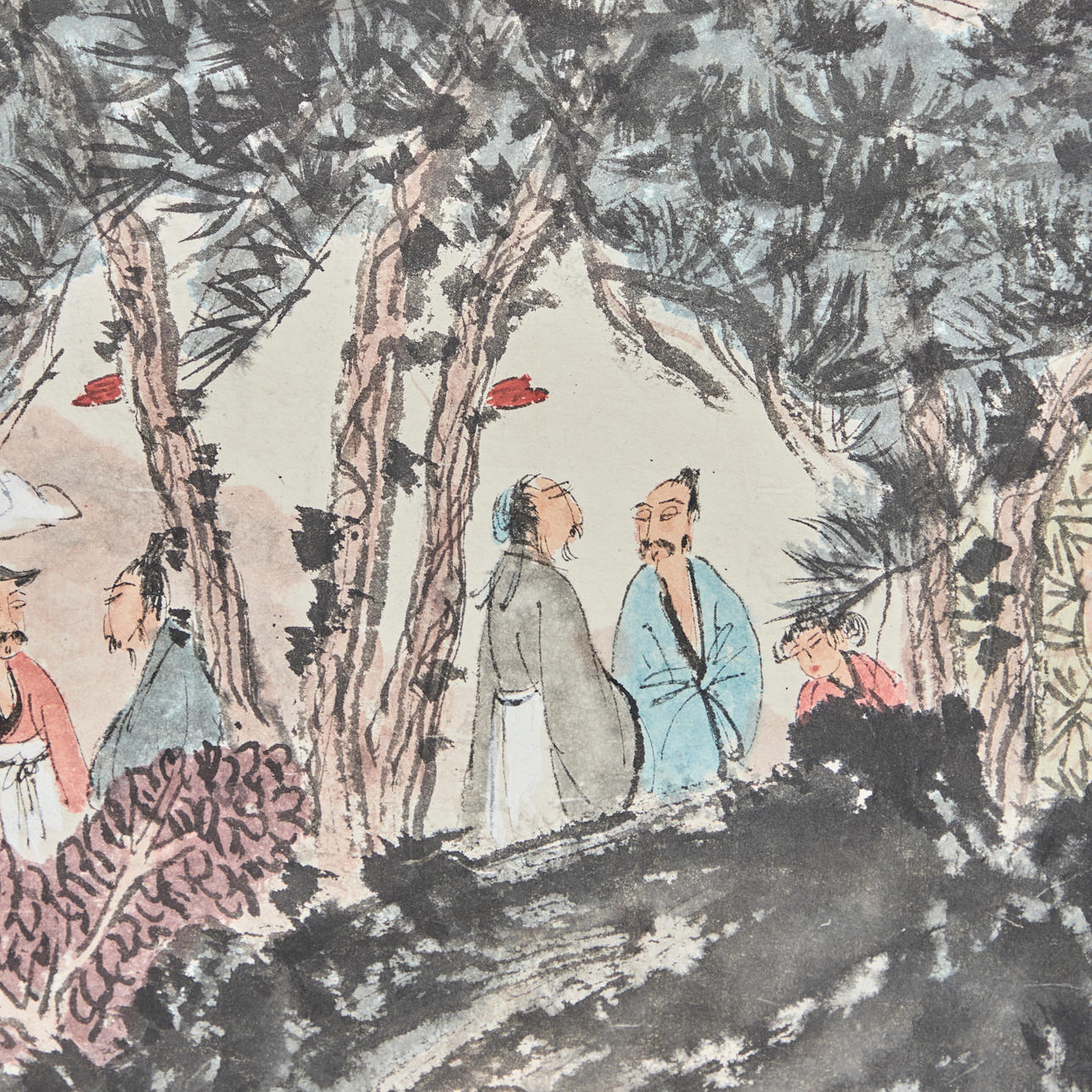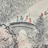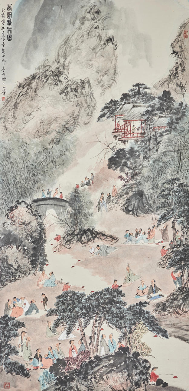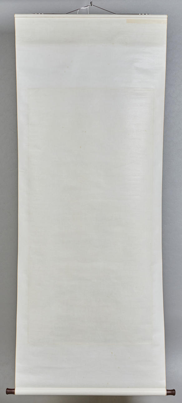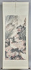 Chinesisches Rollbild NACH Fu Baoshi 1904 - 1965, mit der Darstellung eines Gartens, Tusche auf Papier, polychrom gefasst, in chinesischer Kalligraphie beschriftet und dreifach gesiegelt, ca. 139x67,5cm, als Rollbild auf festem Papier mit Vorderseitenmontage aus Seide aufgezogen, mit Holzstab beschwert, ca. 205x82cm.