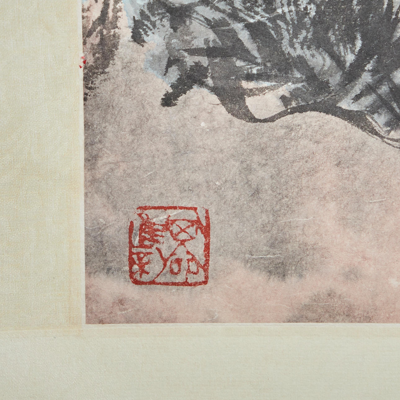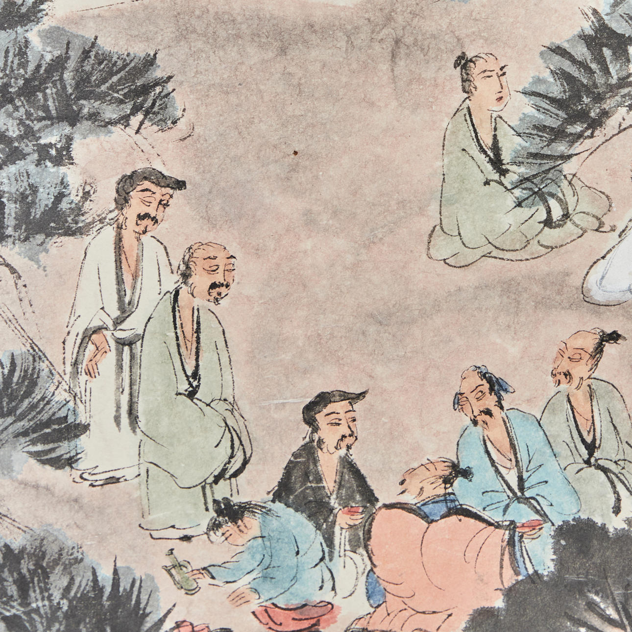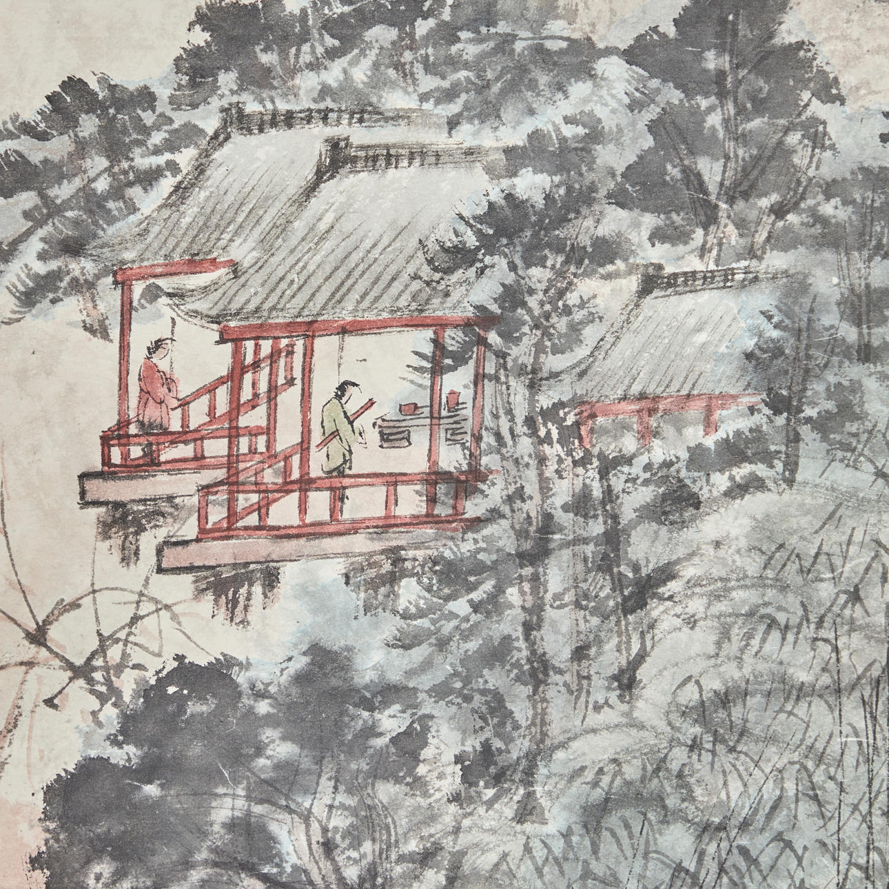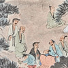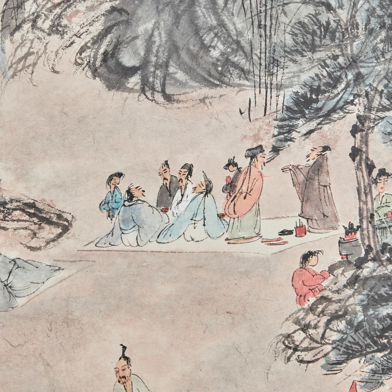 Chinesisches Rollbild NACH Fu Baoshi 1904 - 1965, mit der Darstellung eines Gartens, Tusche auf Papier, polychrom gefasst, in chinesischer Kalligraphie beschriftet und dreifach gesiegelt, ca. 139x67,5cm, als Rollbild auf festem Papier mit Vorderseitenmontage aus Seide aufgezogen, mit Holzstab beschwert, ca. 205x82cm.