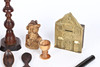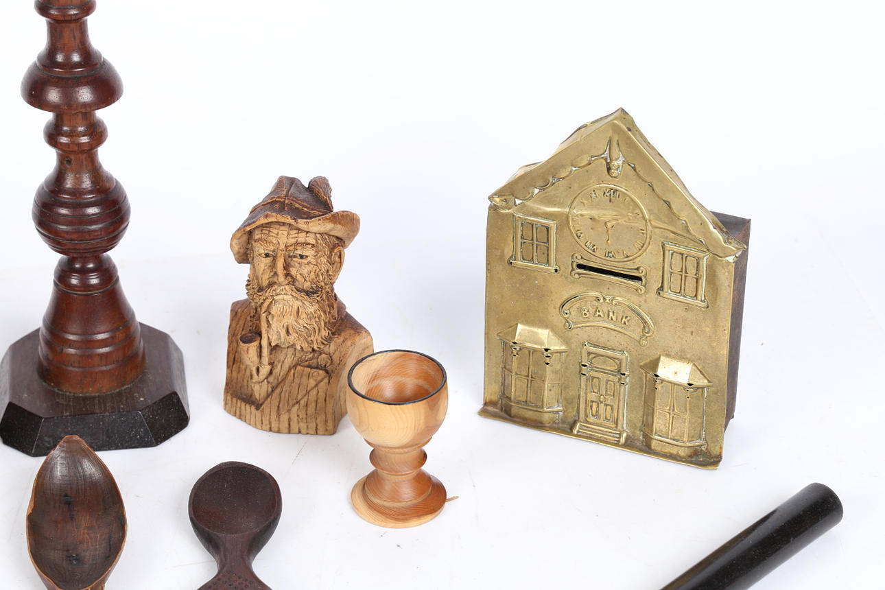 Verschiedene grüne Gegenstände, darunter eine Apfelgröße, Schalen, ein Topf mit Deckel, eine kleine geschnitzte Büste eines pfeifenrauchenden Mannes, ein rollendes Lineal usw., gehört ebenfalls zu diesem Los eine übliche Spardose aus Messing, die einer Bank nachempfunden ist. (Menge).