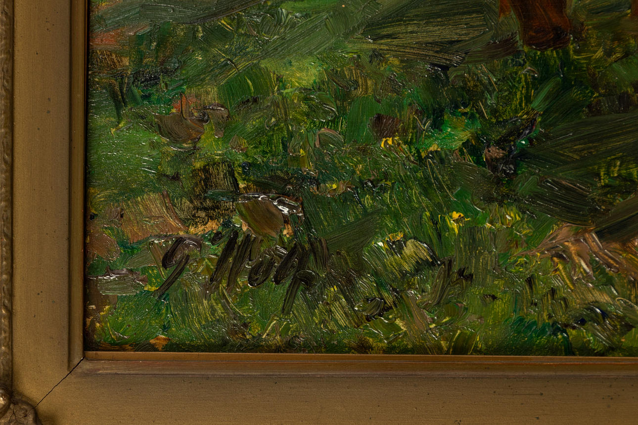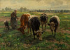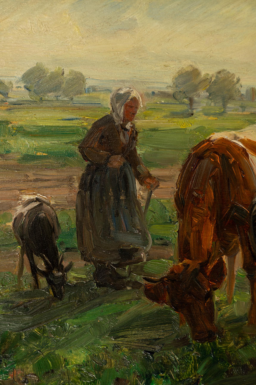 Georg Wolf (1882-1962), Magd mit Kühen, Öl auf Holz, signiert , ca. 40 c 55 cm, mit Rahmen ca. 61 x 77 cm.