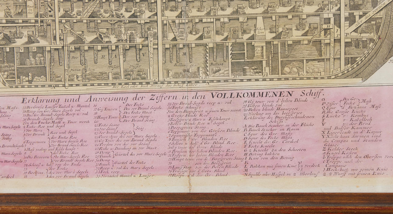 HOMANN, J. B. Neue Tafel, for all liebhabers, and see-fahrende personas. Der Aufbau eines Orlog- oder Kriegs-Schiffes, mit Seinen Volligen Tow & Seilwerck Sampt a Durchgeschnittnen Schiff... Nürnberg um 1720.