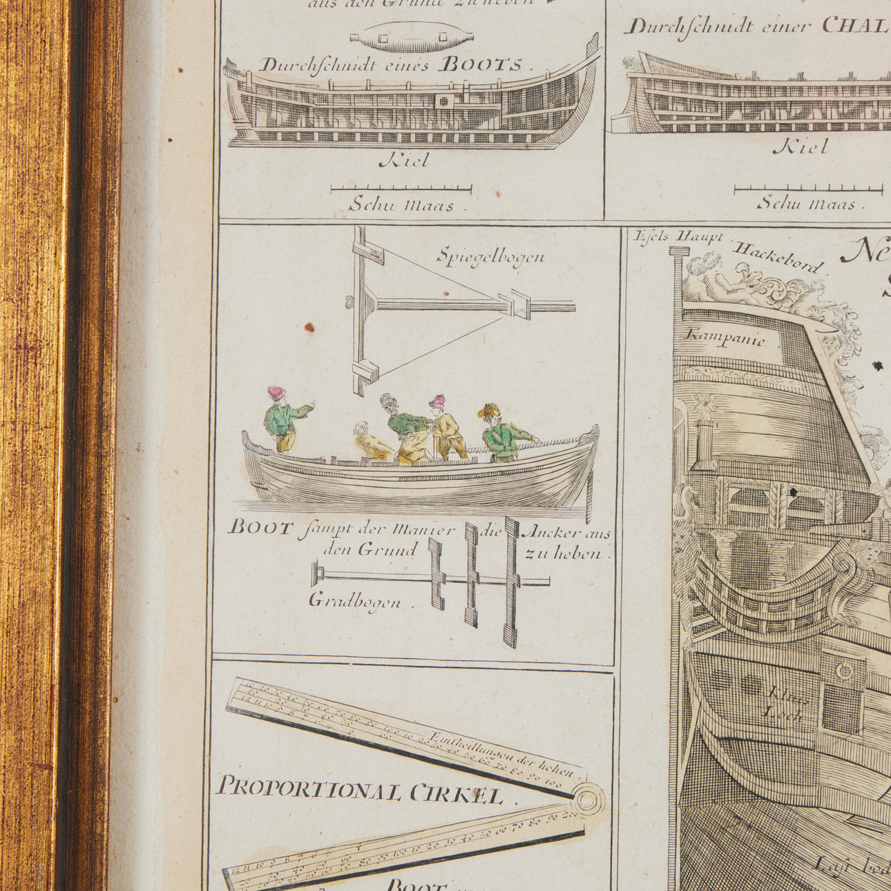 Handkolorierte Gravurplatte mit Schiffen und Kompassen, ca. 485x580 mm. An Bord montiert.