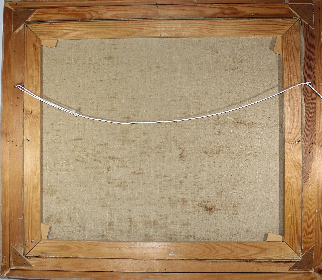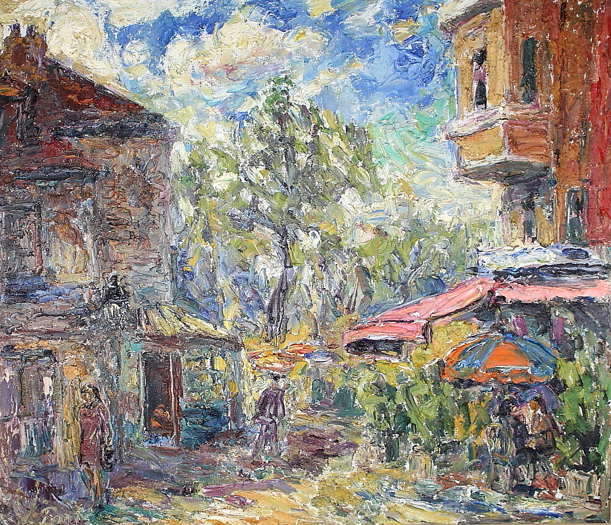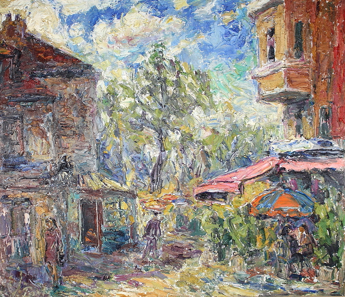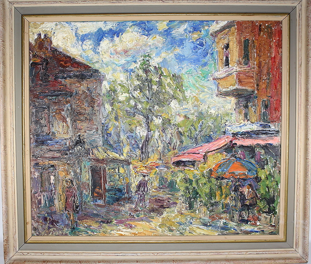 339044. OIDENTIFIERAD KONSTNÄR. Öl auf Leinwand, Außenbestuhlung, signiert.