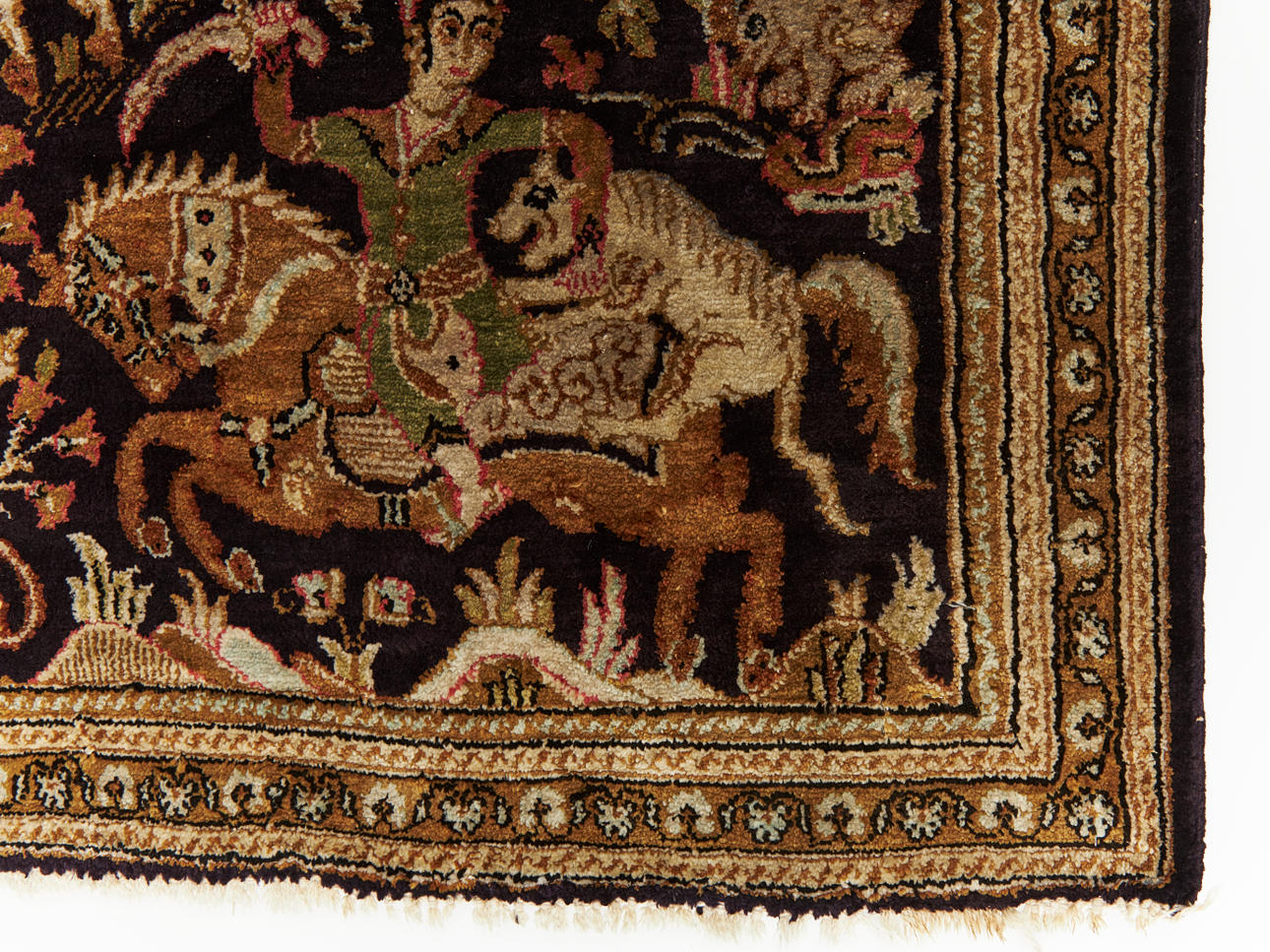 ORIENTTEPPICH, persisch, Seidenelemente, Muster mit Reiter und Tier.