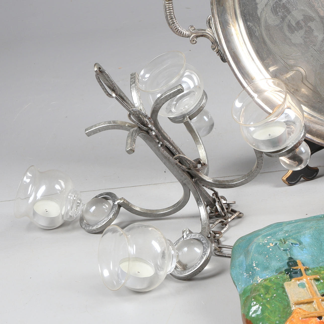 1 Kronleuchter aus Zinn und Glas, vier Arme.
