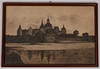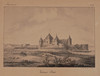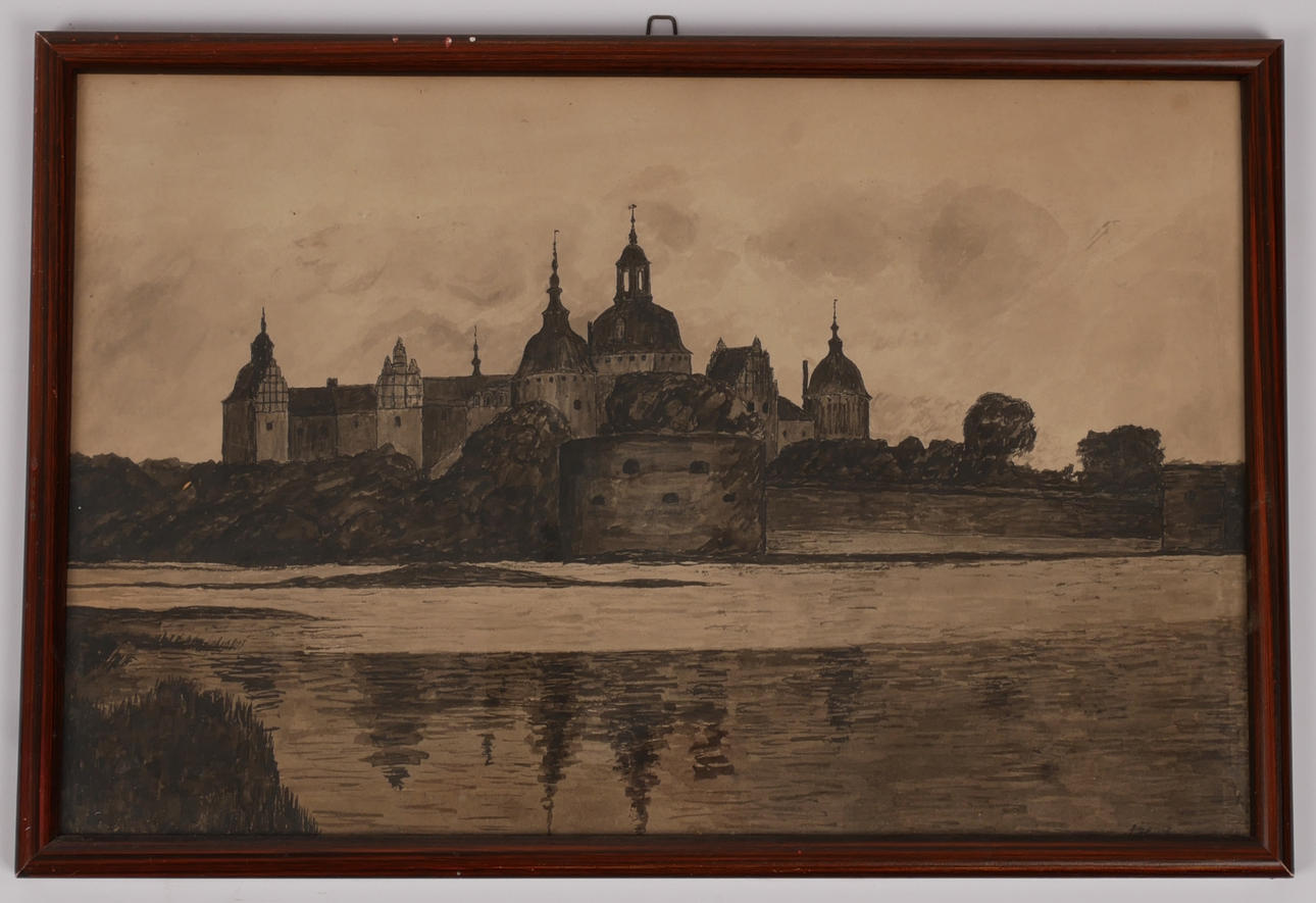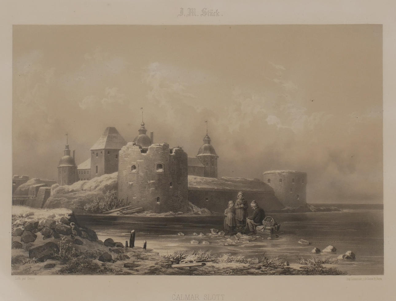 Wahrscheinlich Zeichnung/Tusche mit unbekannter Signatur (hinter Rahmen). Dreifarbiger Druck mit der Aufschrift „Lith par deroy“, Schloss Kalmar in den 1850er Jahren nach J.W. Halt die Klappe.