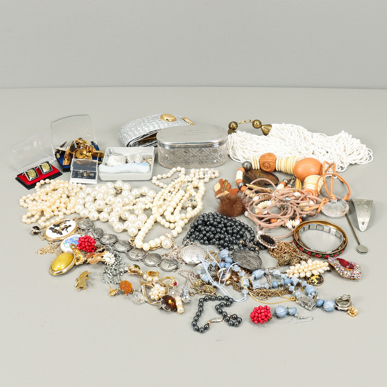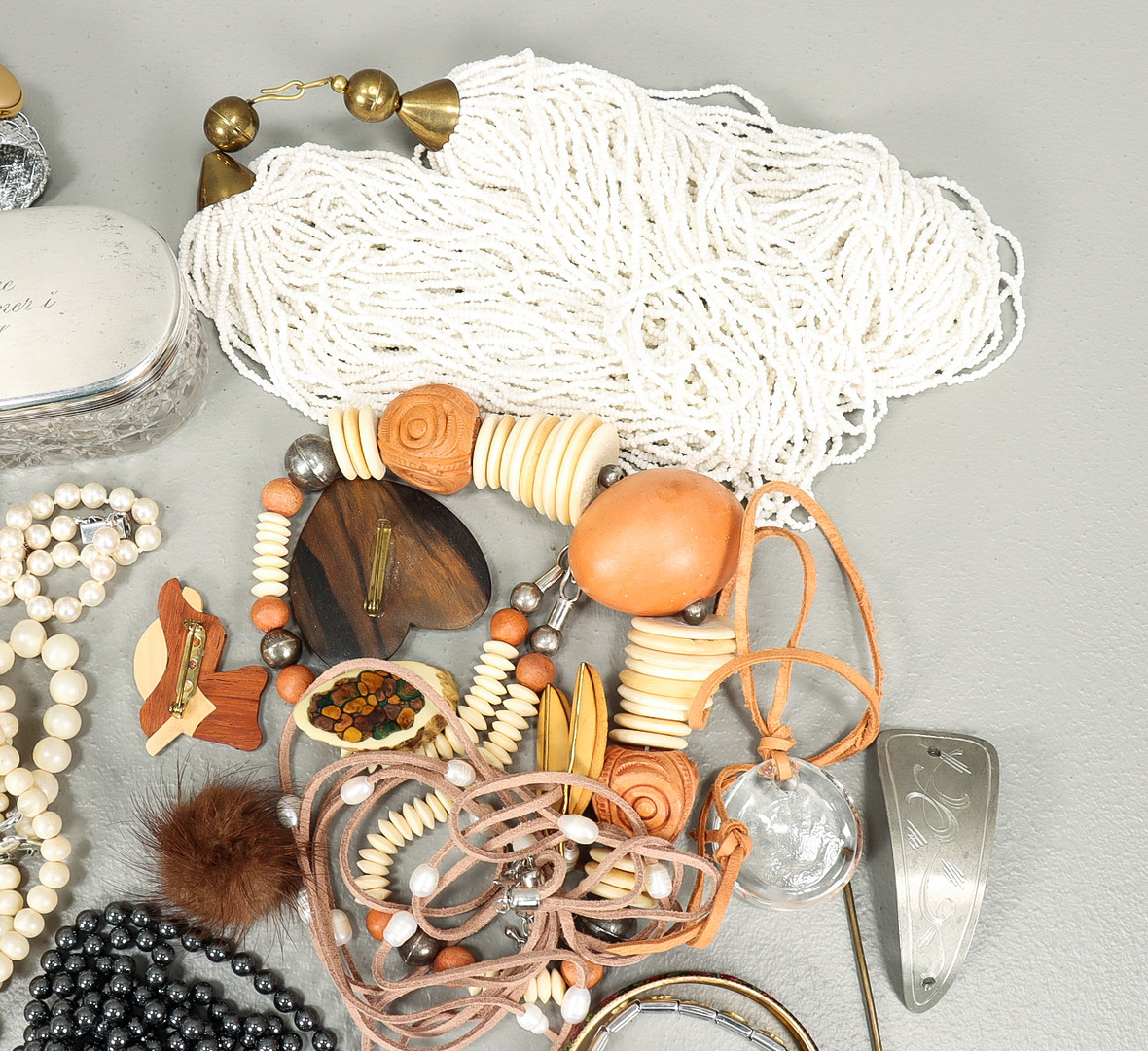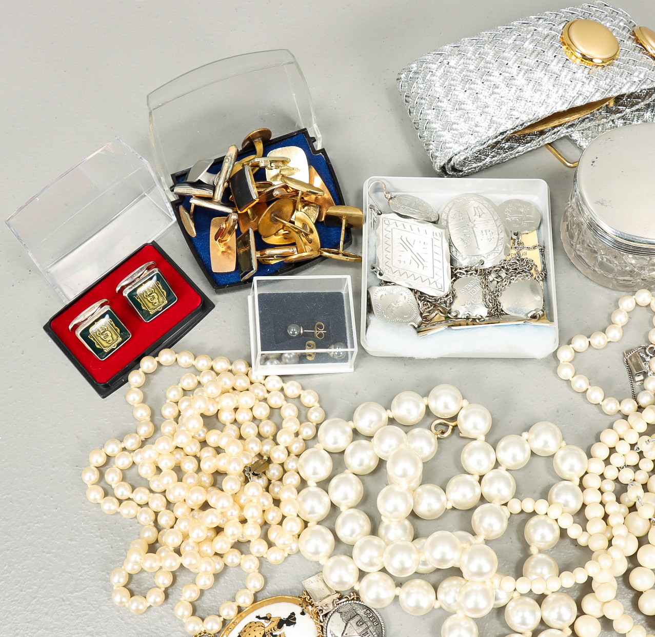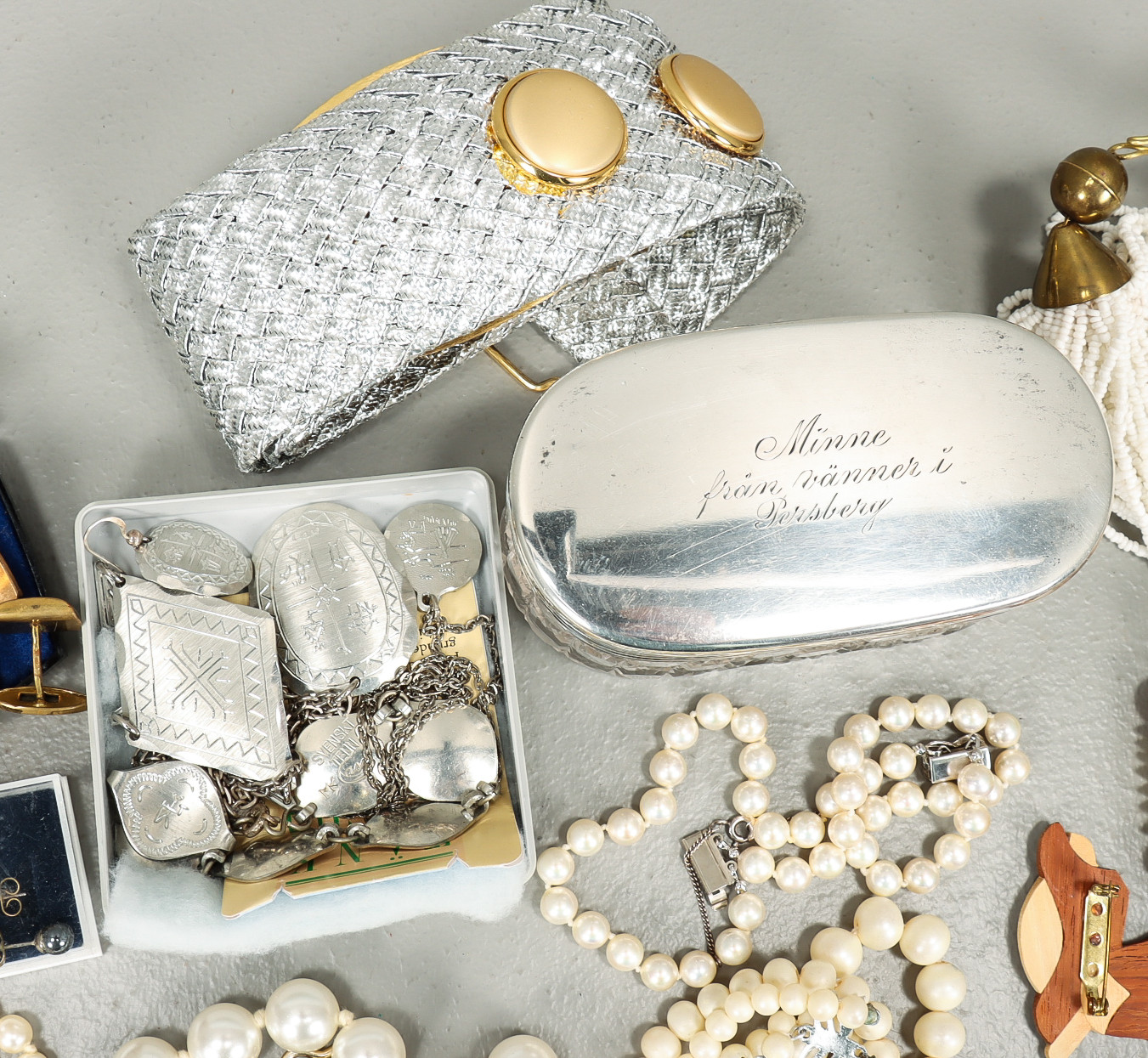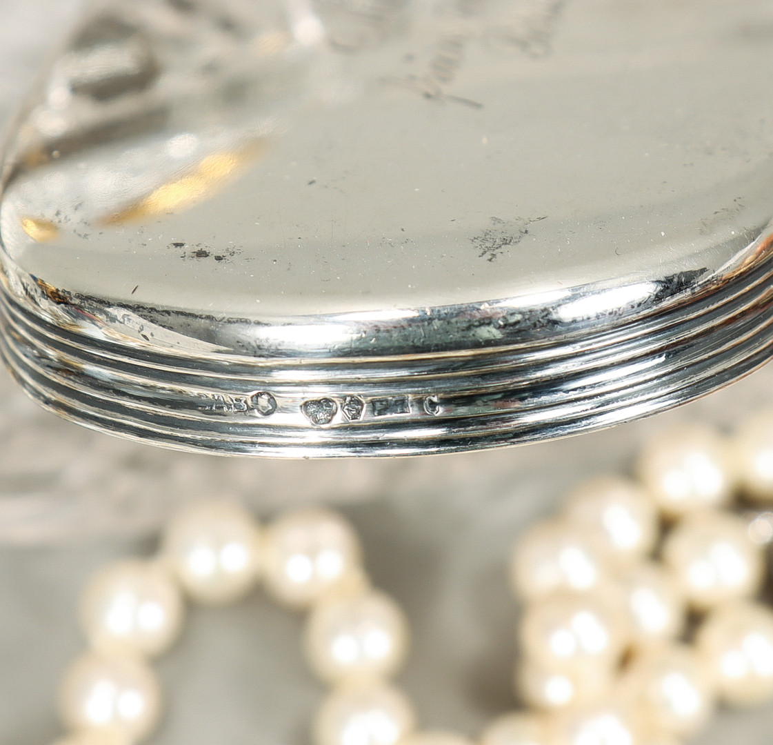 3407137. BIJOUTERIE UND GLAS MIT SILBERNEM DECKEL.