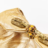 Goldfarbenes Leder, Öffnung mit Perlenband aus gelbem Metall, Metallgriff mit lackierten Details, Magnetverschluss, mit Filzstoff ausgekleidet, inklusive Staubbeutel, Maße ca. 16x28 cm.