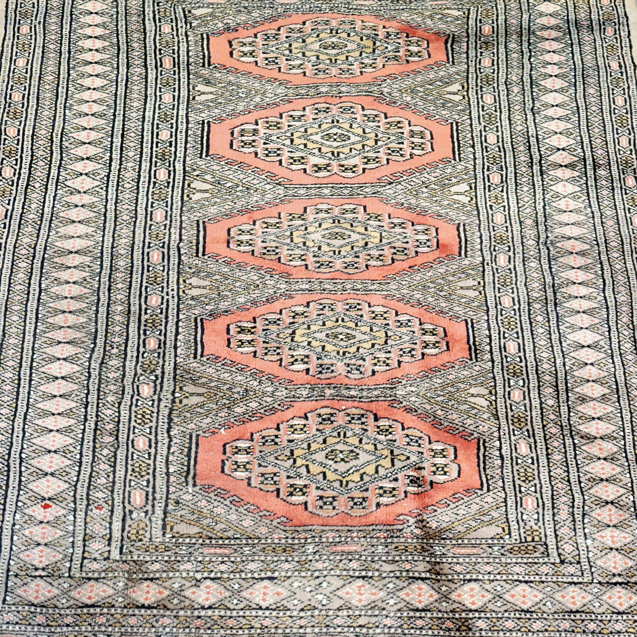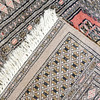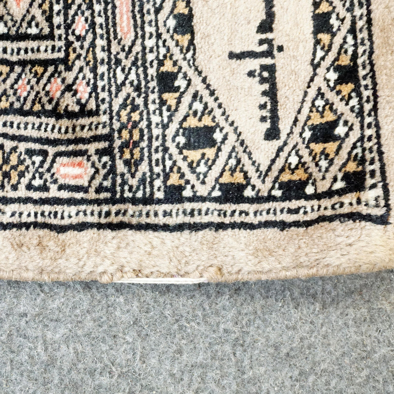 Handgeknüpfter Teppich mit der Aufschrift Pakistan. Signiert. Geometrisches Muster in Rosa, Schwarz, Braun auf beigem Hintergrund.