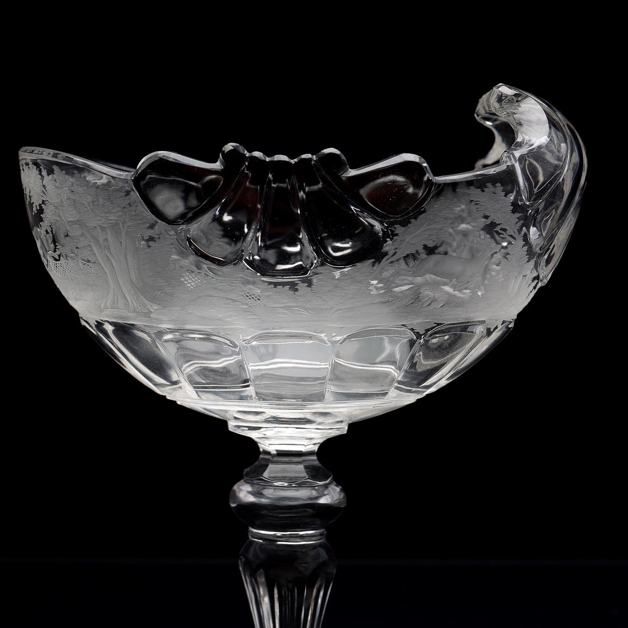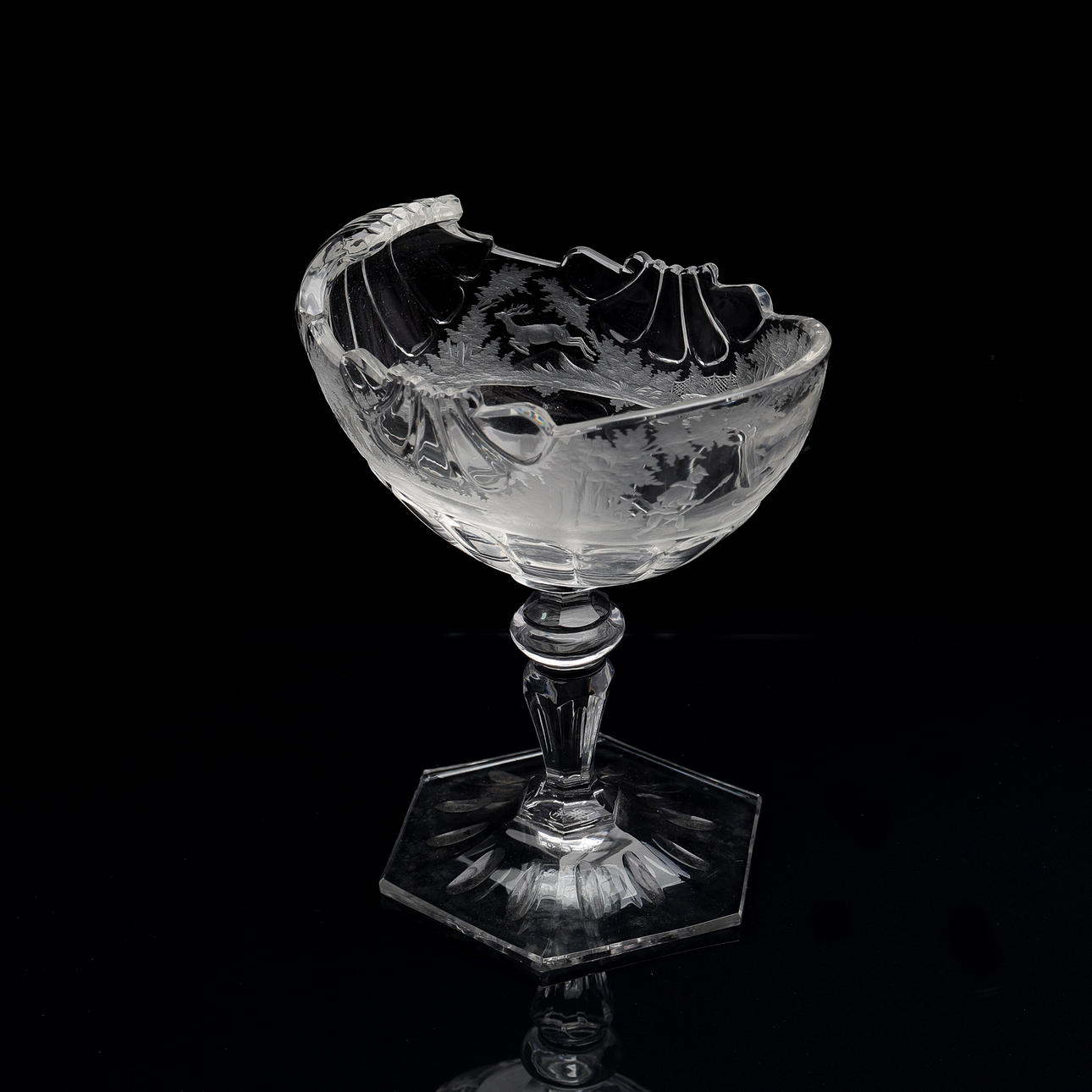 Nautilusform, profiliertes Bein und sechseckiger Fuß, graviertes Jagdmotiv, Österreich um 1880, Höhe 13 cm.