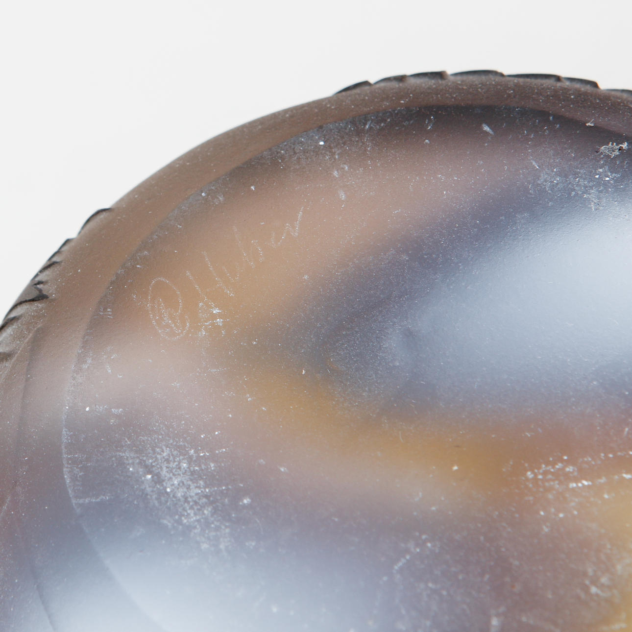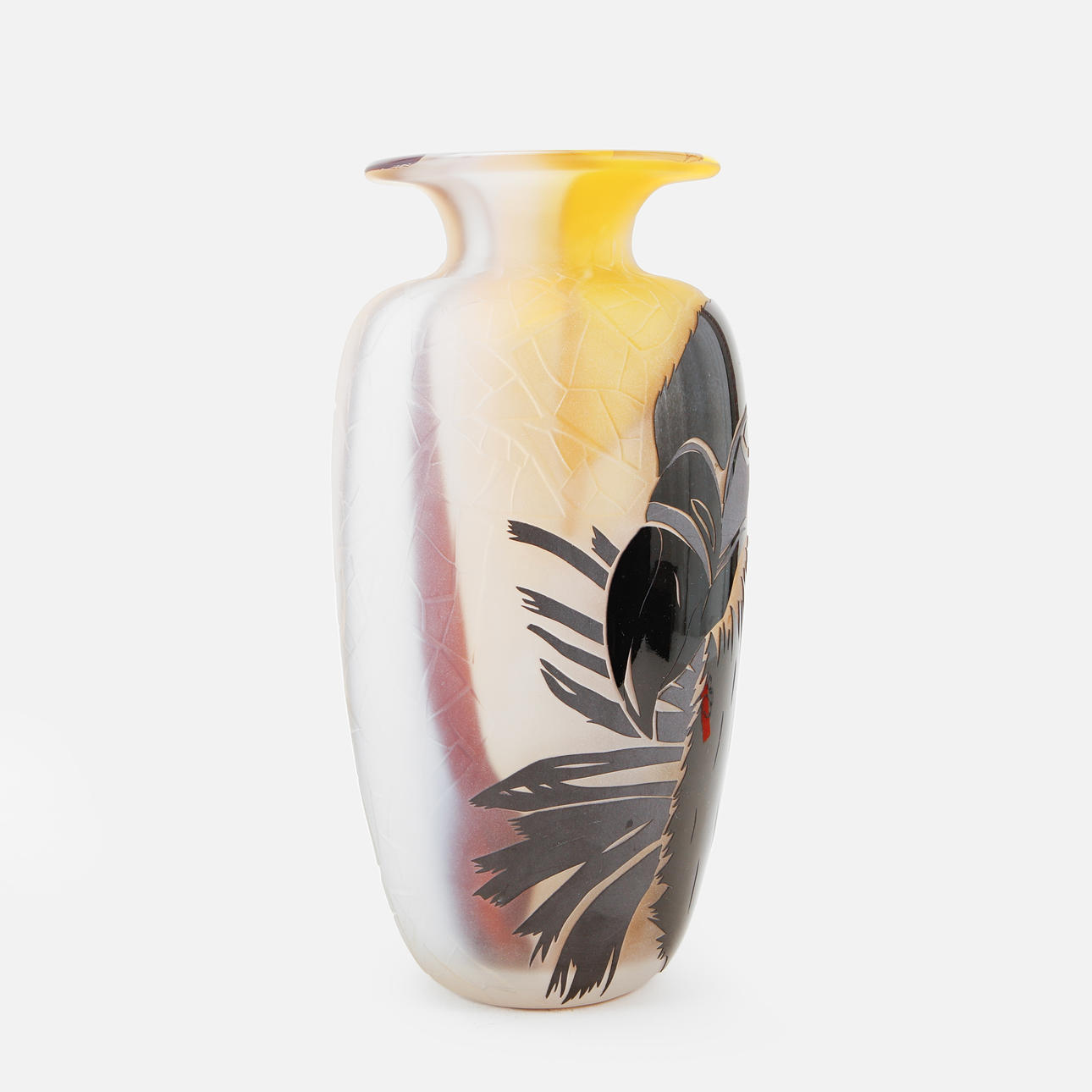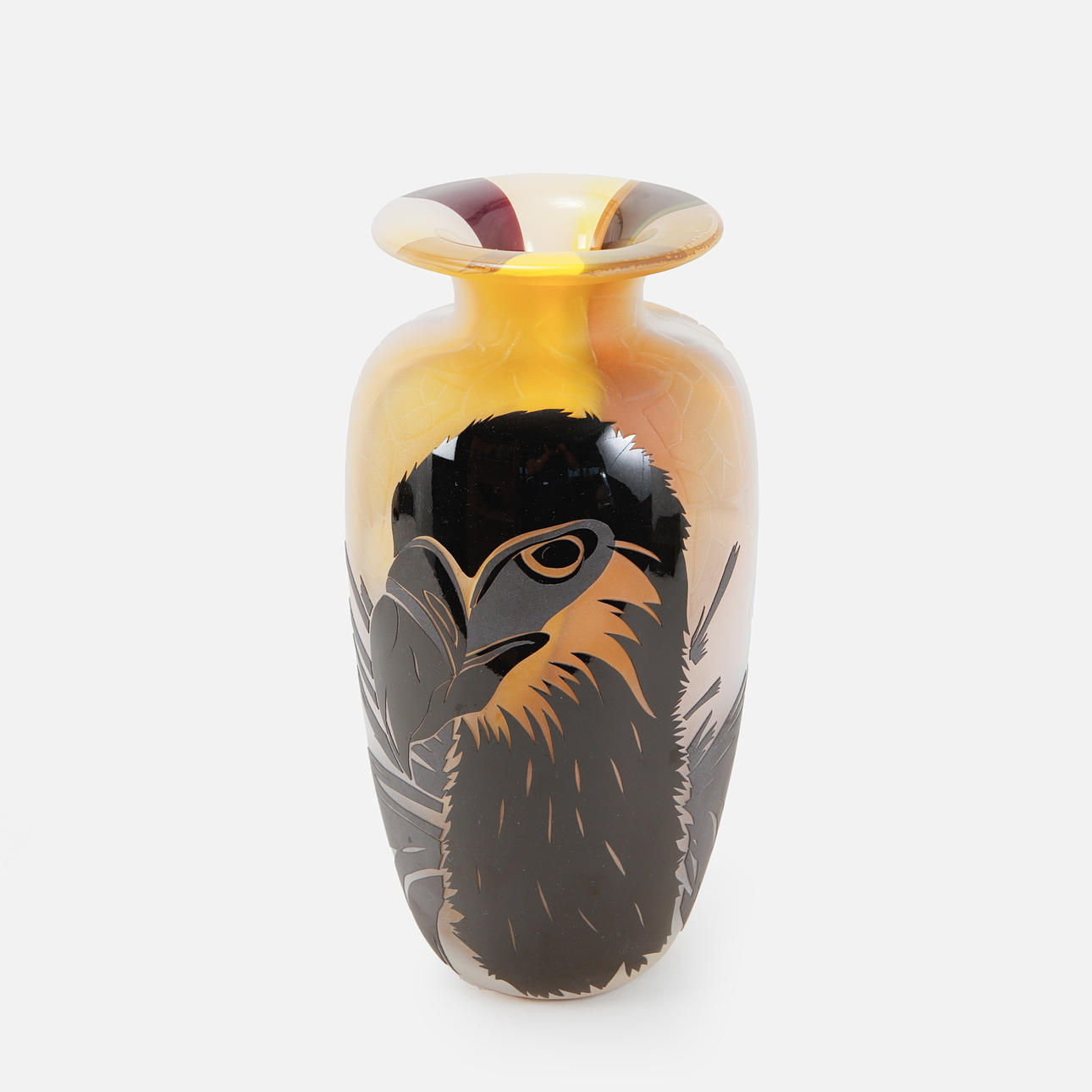 Dekor im braunen Überhang mit geschnittenem und geätztem Greifvogeldekor vor hellem Hintergrund. Höhe 30,5 cm.