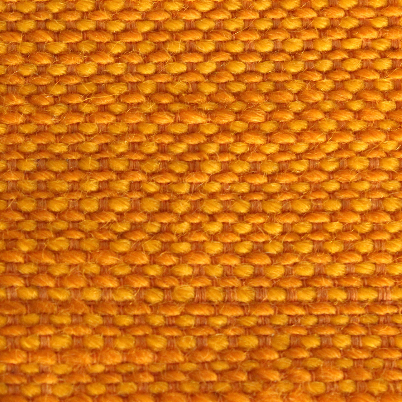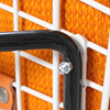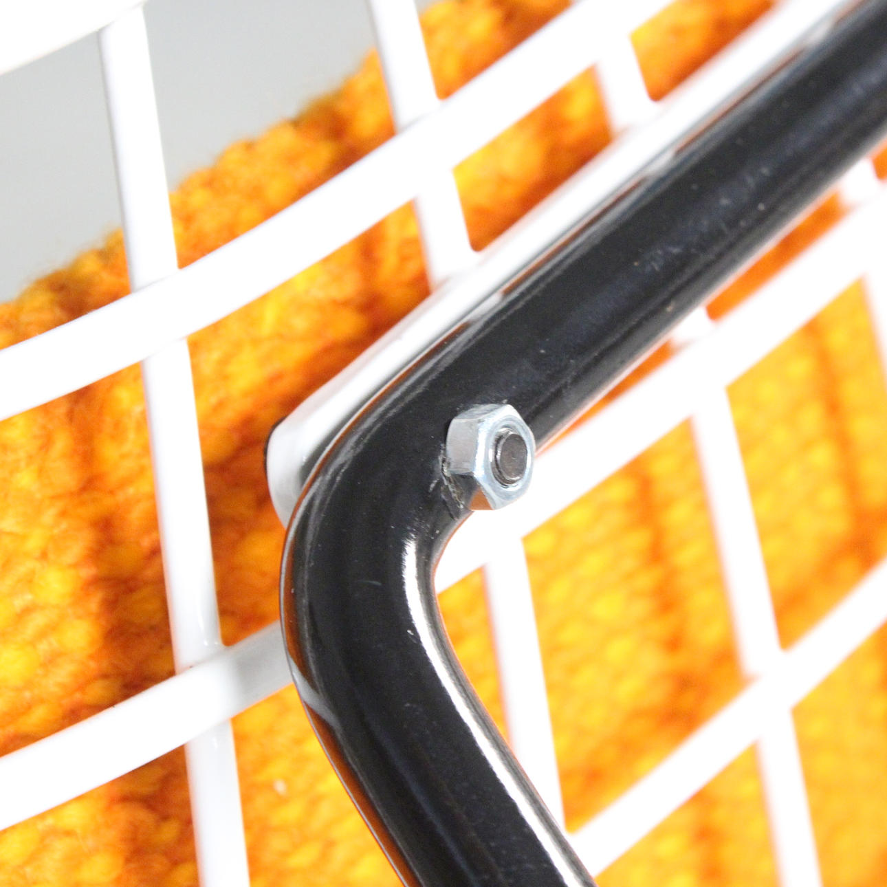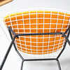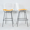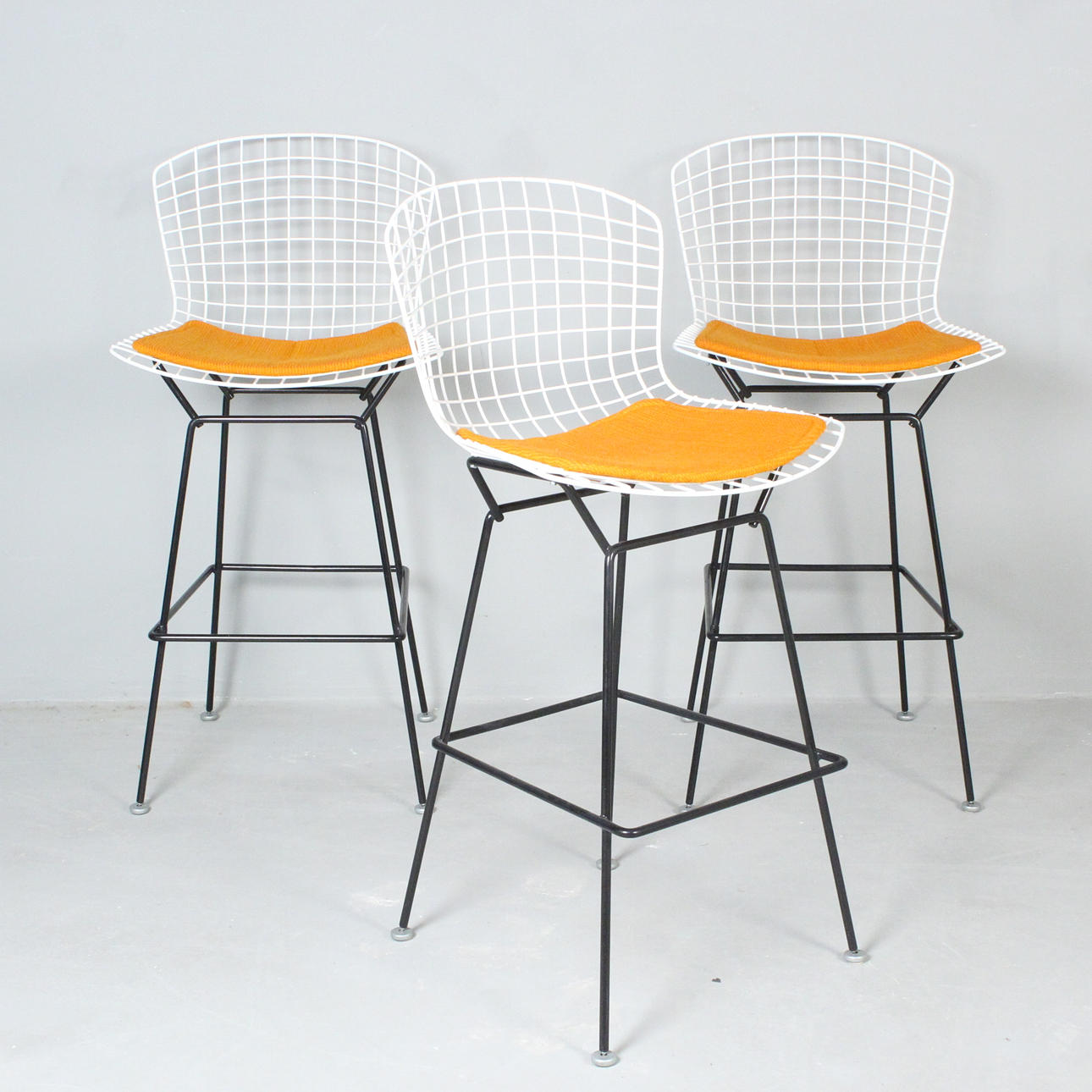 Harry Bertoia (1915–1978), drei Stühle / Barhocker, Stahldraht, Stoff, Sitzschalen aus weiß beschichtetem Stahldraht, jeweils mit Sitzkissen aus orangefarbenem Stoff,