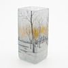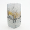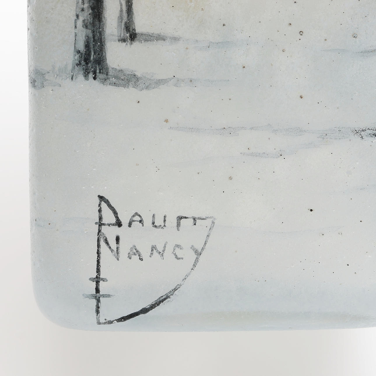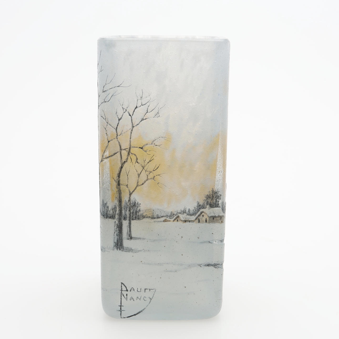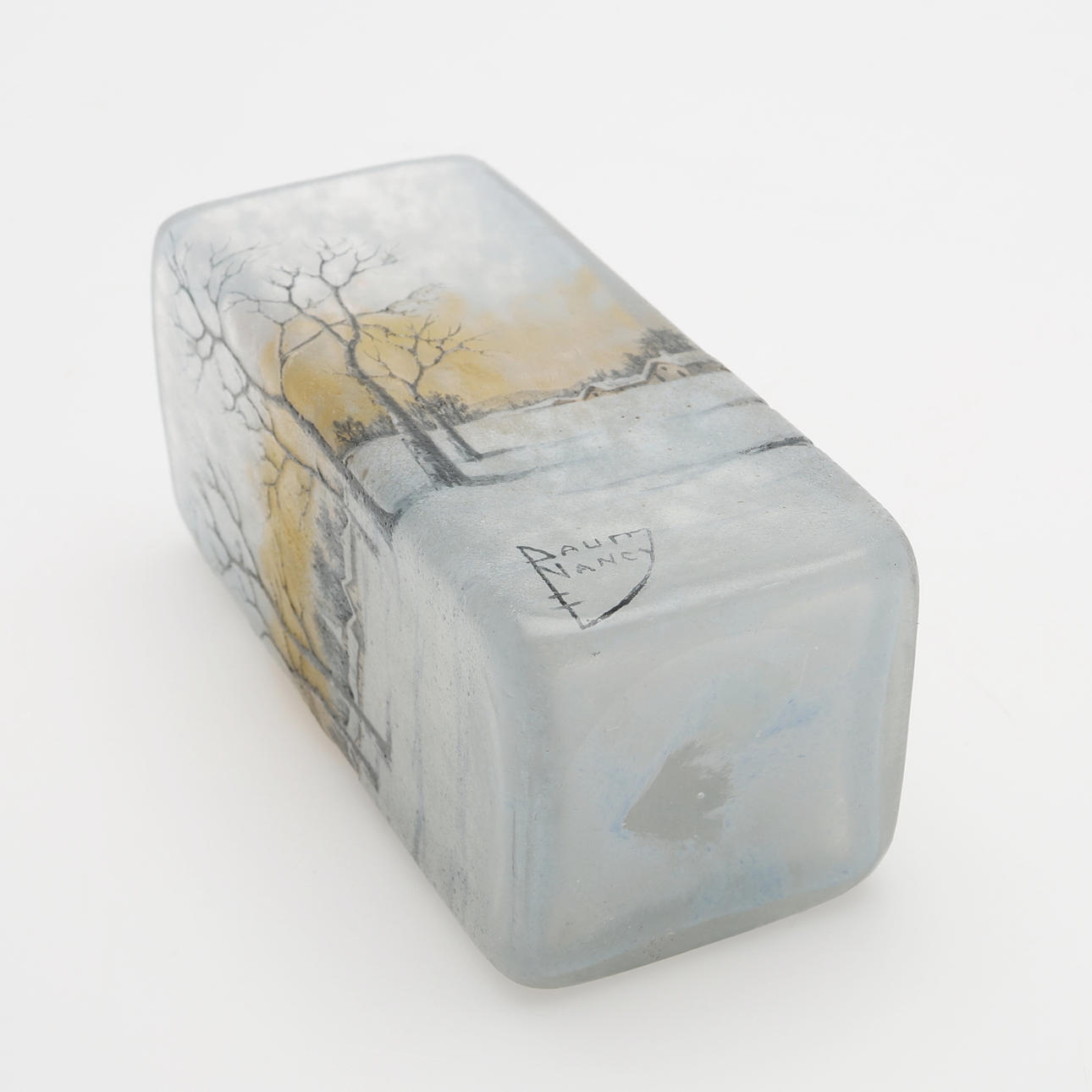 Jugendstil, vierseitige Form, meliertes Glas in Weiß und Orange mit geätzter und emaillierter Winterlandschaft mit Schnee und Windmühle, signiert „DAUM NANCY“ und mit Lothringerkreuz, Frankreich, erste Hälfte des 20. Jahrhunderts, Höhe 12 cm.
