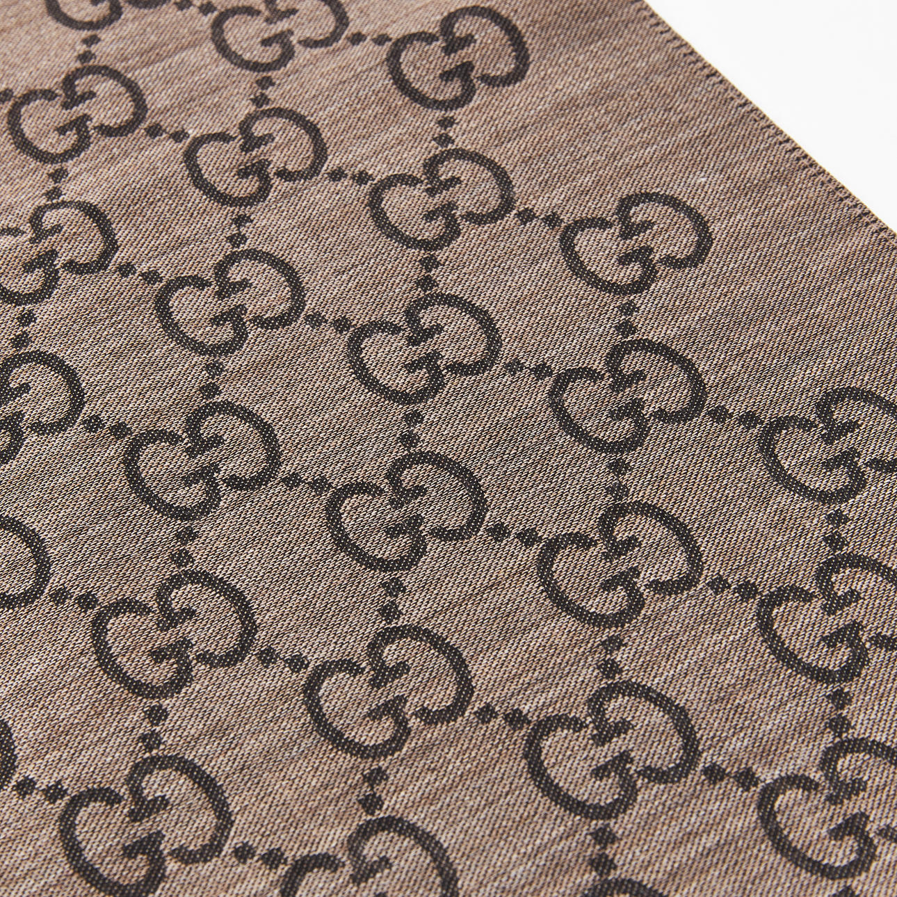 Seiden- und Wollmix, braun mit eingewebtem Monogrammmuster. Gestempelt „GUCCI“, ca. 48 cm x 180 cm.