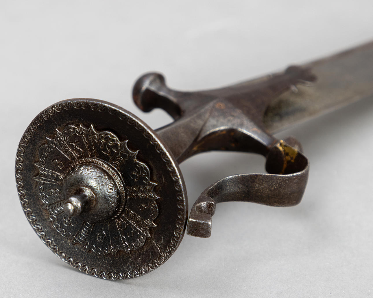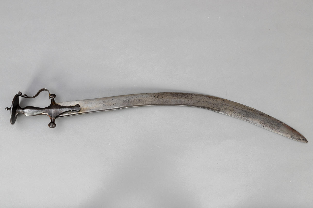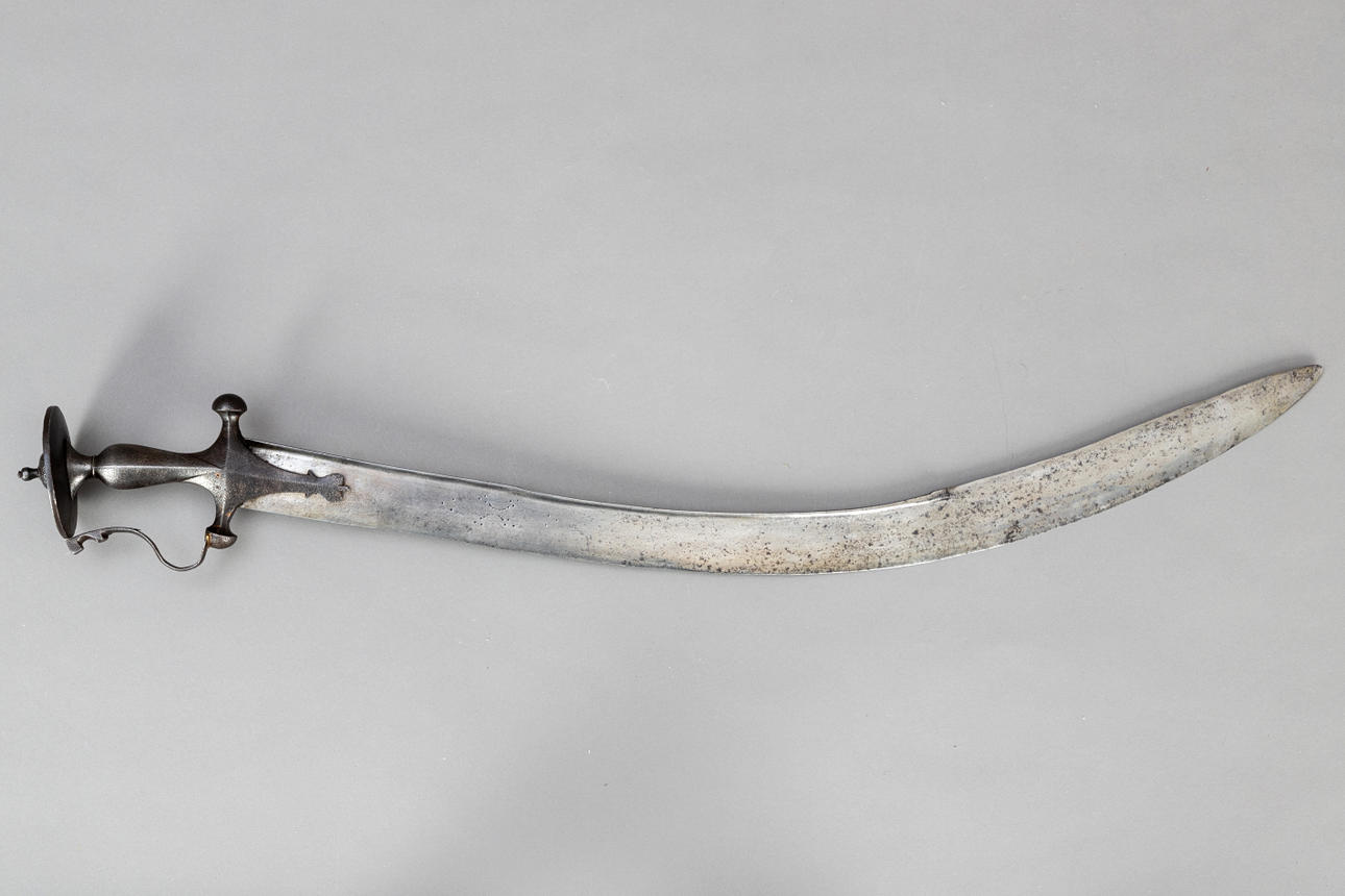 Das Talwar ist ein indischer Säbel. Das angebotene Exemplar aus dem 17. Jahrhundert weist die typischen Elemente, wie die gebogene Klinge, eine kreuzförmige Parierstange mit Faustschutzbügel und einen verzierten scheibenförmigen Knauf am Ende des Griffes, auf. Typisch für das 17. Jahrhundert ist der gebogene Mittelteil des Griffes, der bei späteren Stücken gerade wurde. Die Pommel ist auf der Unterseite reich graviert. Die osmanisch-kilidsch-ähnliche Klinge ist ungewöhnlich und mit einer Meistermarke versehen (zwei Halbkreise mit jeweils drei Punkten an den Enden und jeweils drei Punkten als Begrenzung), wie sie in Nordindien öfter gefunden wird.