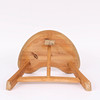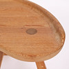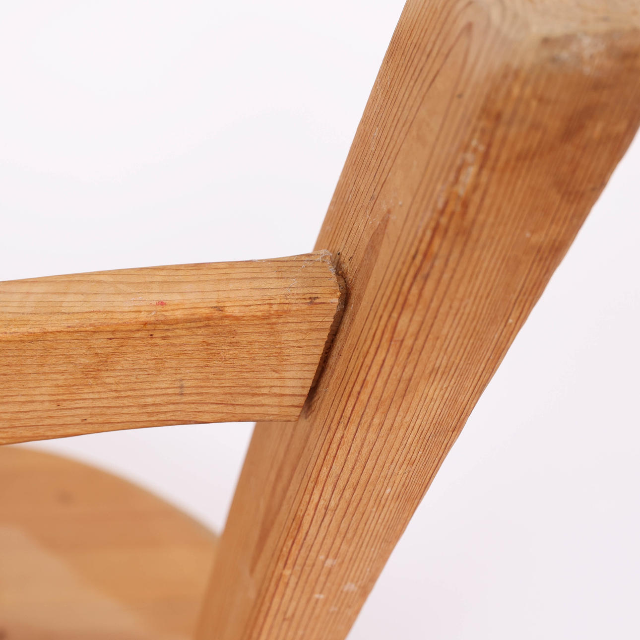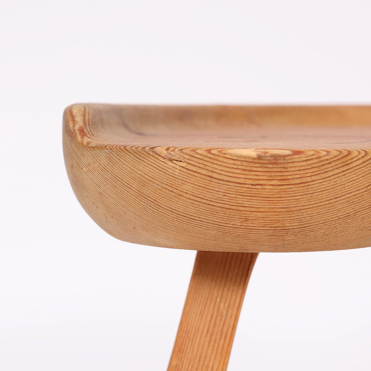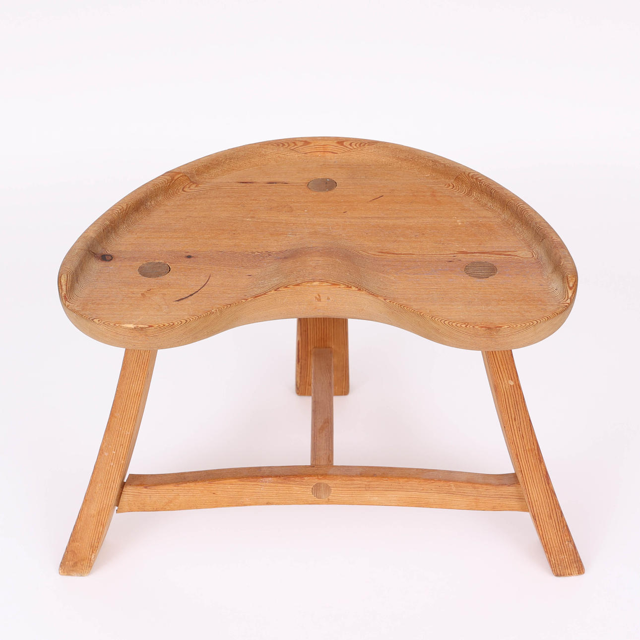 Dreibeiniger Hocker aus Kiefernholz mit befestigtem Beinständer, unmarkiert.
