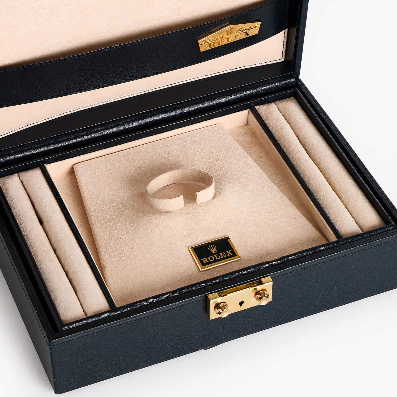 Schubladeninnenraum in zwei Ebenen, oberer Teil mit Platz für eine Uhr. Verschiedene Broschüren, darunter die Rolex Oyster, und ein Rolex-Kartenetui sind im Lieferumfang enthalten. ca. 30x21,5 cm, Höhe ca. 10 cm.