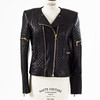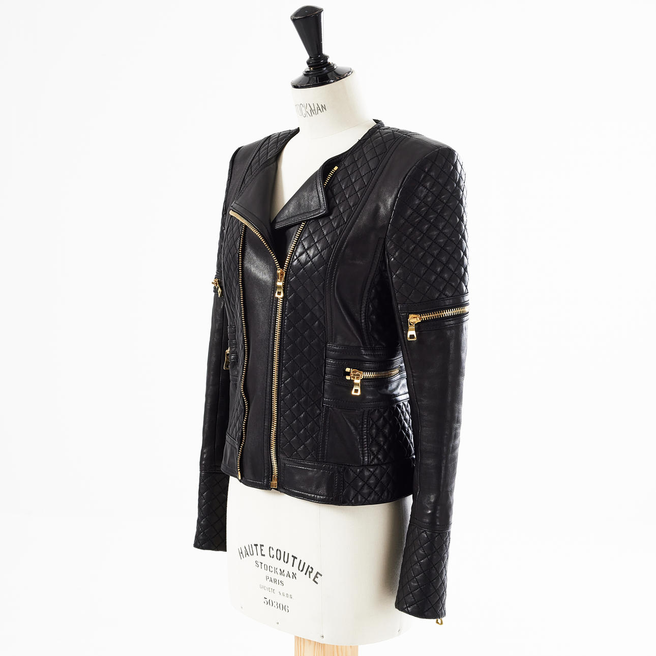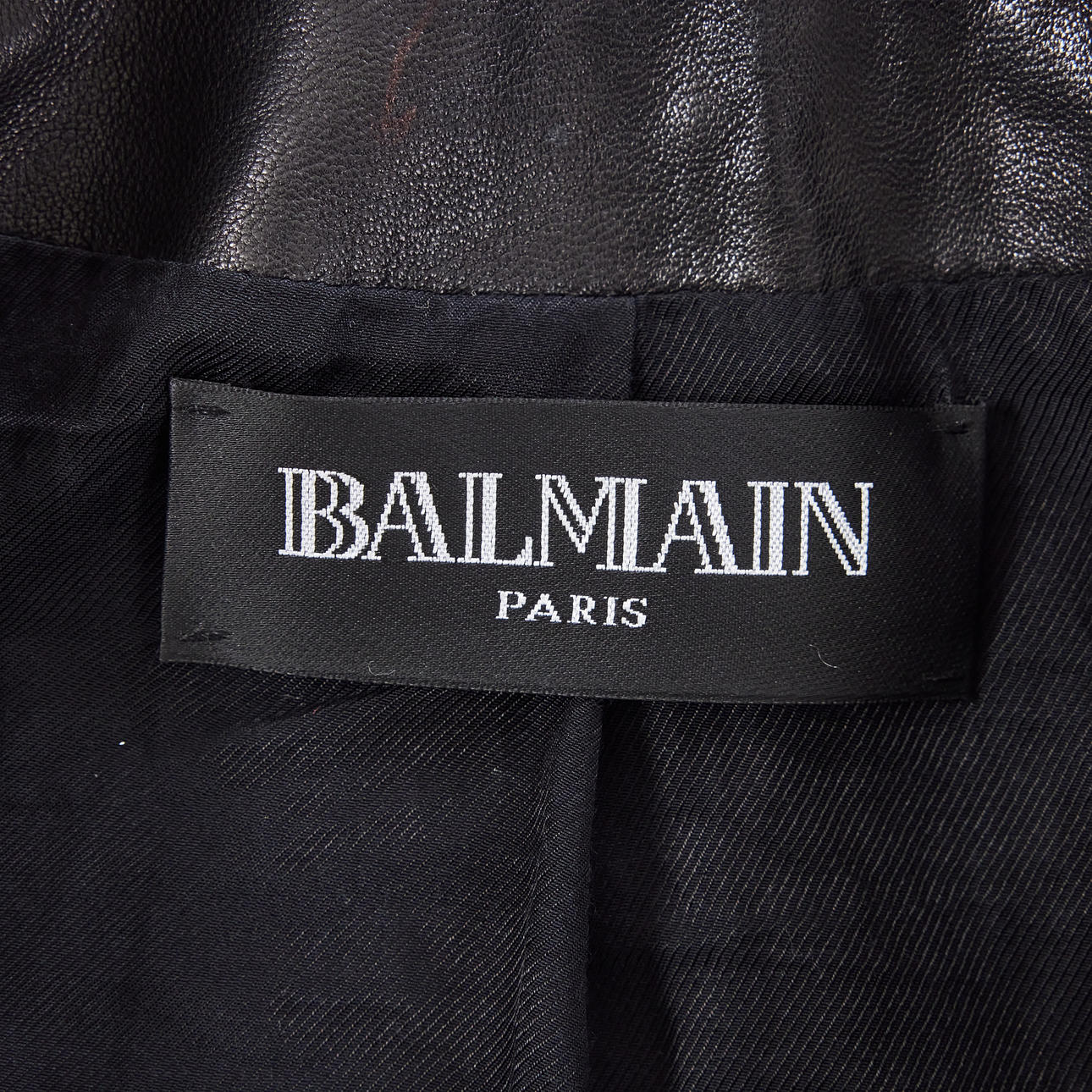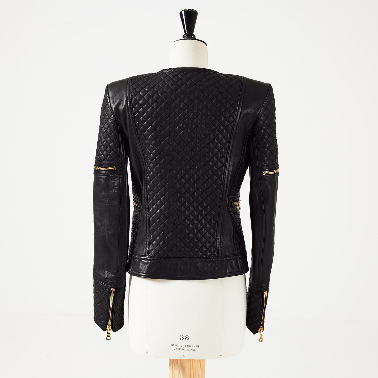Schwarzes Lammfell, teilweise gesteppt, markierte Schultern, Reißverschlüsse aus gelbem Metall, Aufschrift „BALMAIN PARIS“, Größe laut Etikett 38, Rückenlänge ca. 56, Brustweite 89cm.