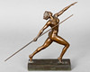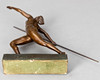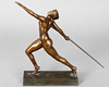 Bronze, dunkelbraun patiniert. Auf dem rechteckigen Sockel die weibliche Figur in der Bewegung des Speerabwurfs. H: ca. 30 cm. Auf der Fußsohle signiert und datiert. Gießerstemple der Kunst- und Glockengießerei Lauchhammer.