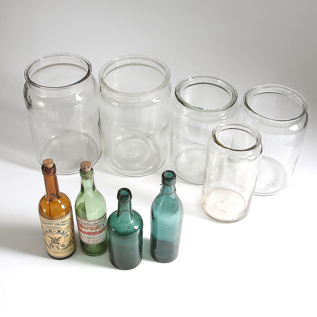 343307. GLÄSER und FLASCHEN, 9 Teile, Glas, 18/1900.