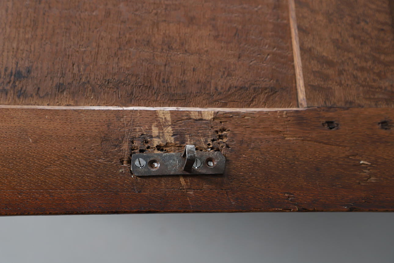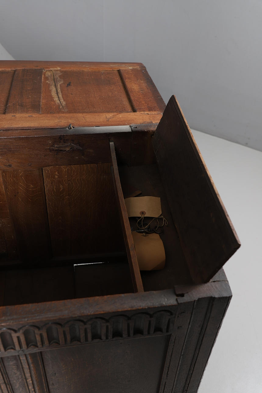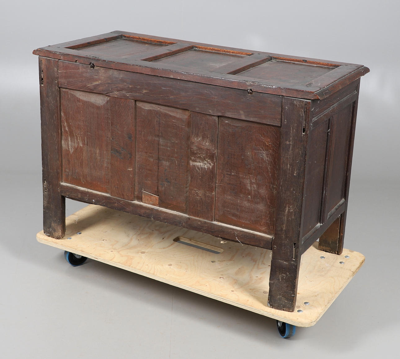 Wahrscheinlich aus dem 18. Jahrhundert, mit einer dreifach getäfelten Oberseite und mit einem geschnitzten Fries an der Unterseite. Mit einer Kerzenbox auf der Innenseite, Oberseite 112 cm x 53 cm, 75 cm hoch.