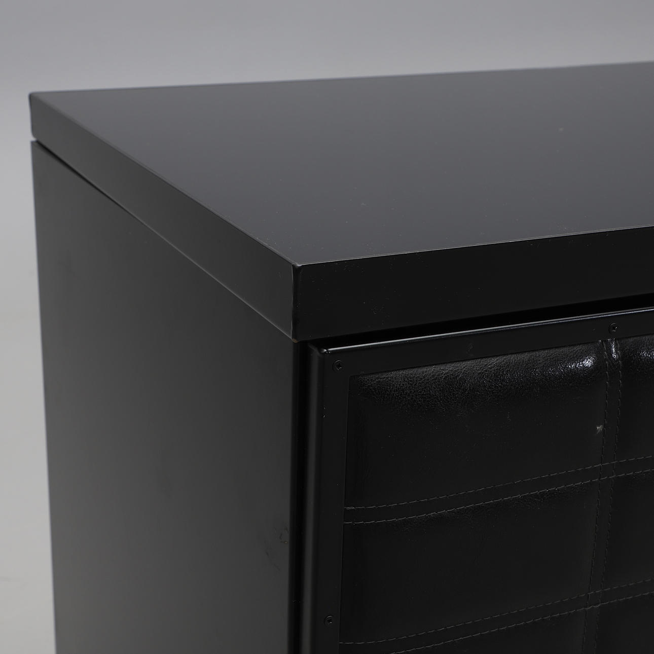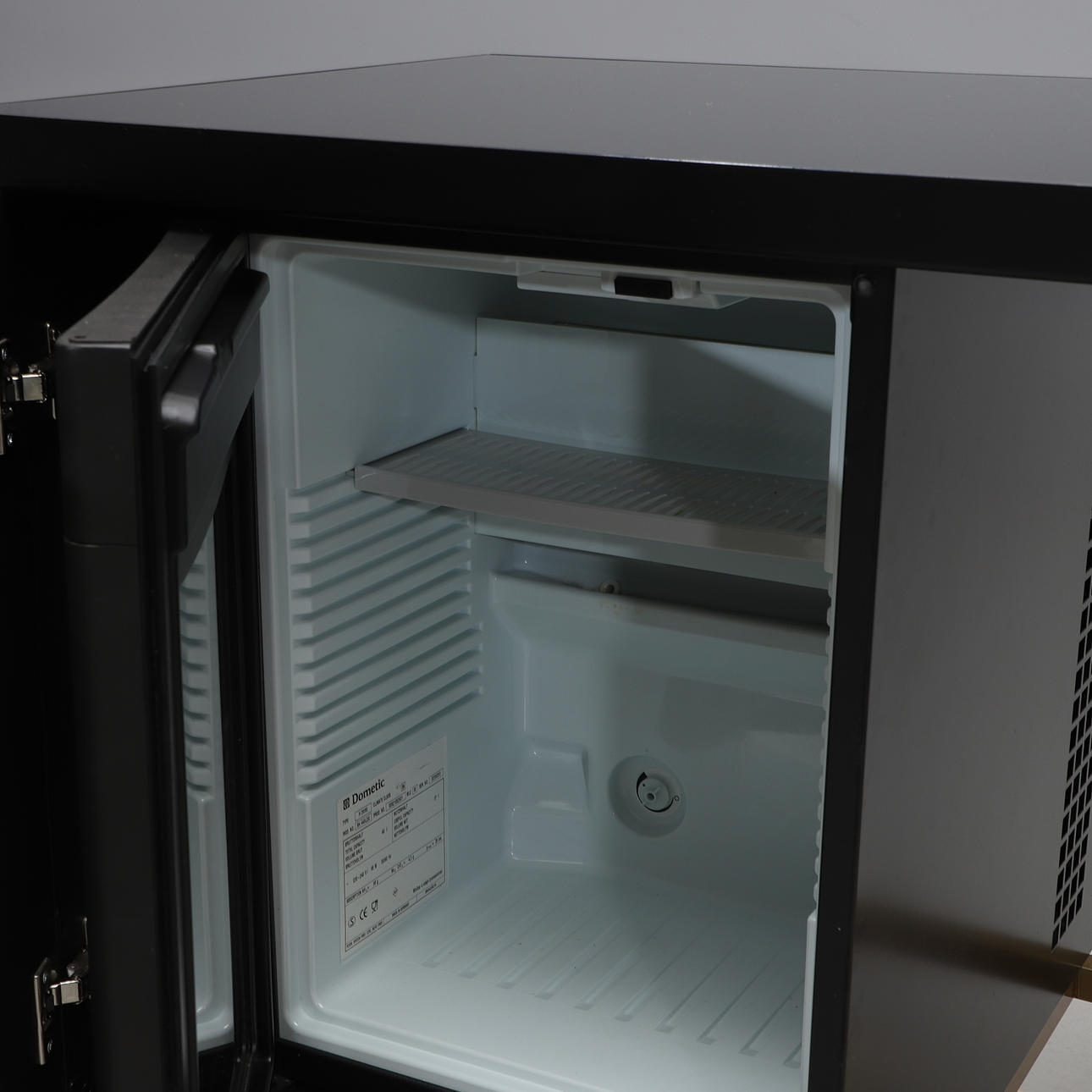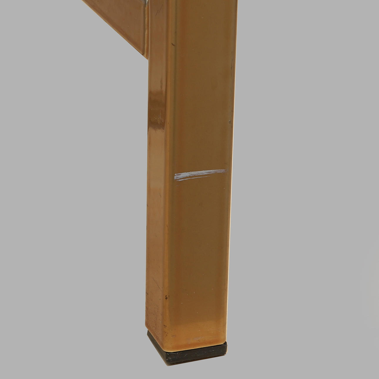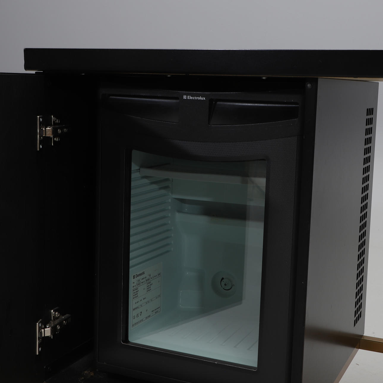 Beine aus gelbem Metall. Glasscheibe in schwarzem Metallrahmen. Tut weh, wenn die Tür mit Leder bezogen ist und der Heckkühlschrank Electrolux. Länge 140, Breite 55, Höhe 74 cm.