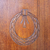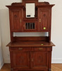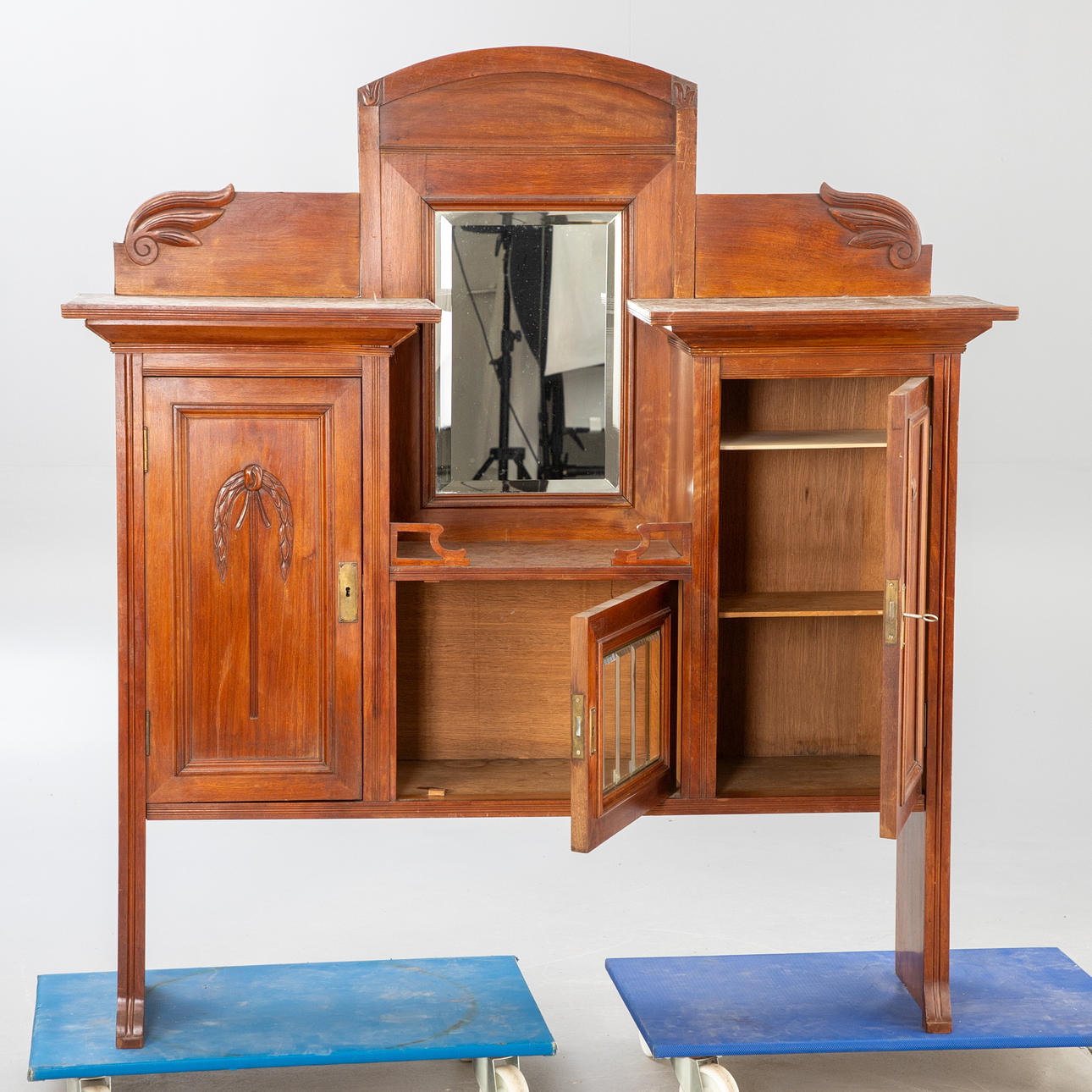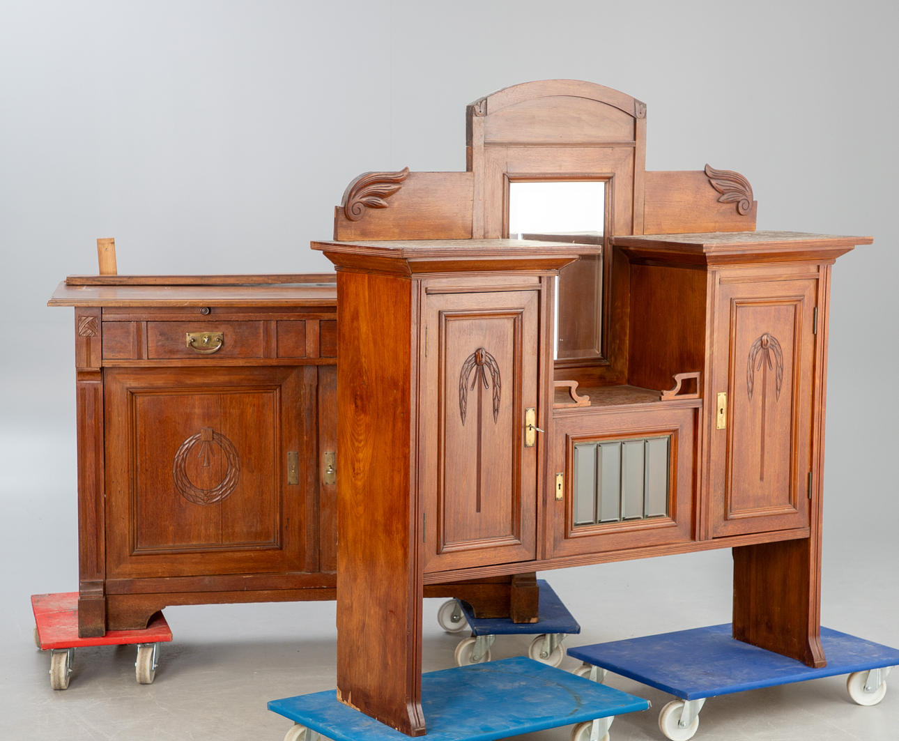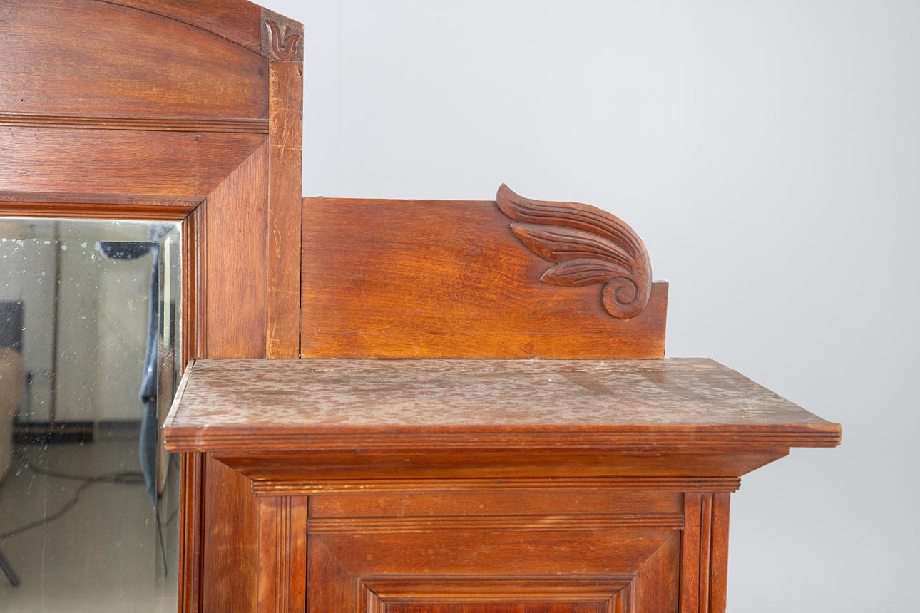 Nußbaum auf Nadelholz furniert, rotbraun lackiert. Zweiteiliger Korpus. Auf Kufen mit breit ausgeschnittener Zarge der rechteckige, zweitürige Schrank und zwei überkragenden Schubladen. Darauf der Aufsatz mit erhöhtem Korpus, frontseitig durch drei Türfächer in verschiedenen Größen gegliedert. Mittig von Spiegel bekrönt. Geschnittene Pflanzenmotive. Füllungen in profilierter Leistenrahmung und Rillen auf den Lisenen. HxBxT: ca. 247 x 141 x 62 cm.