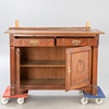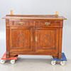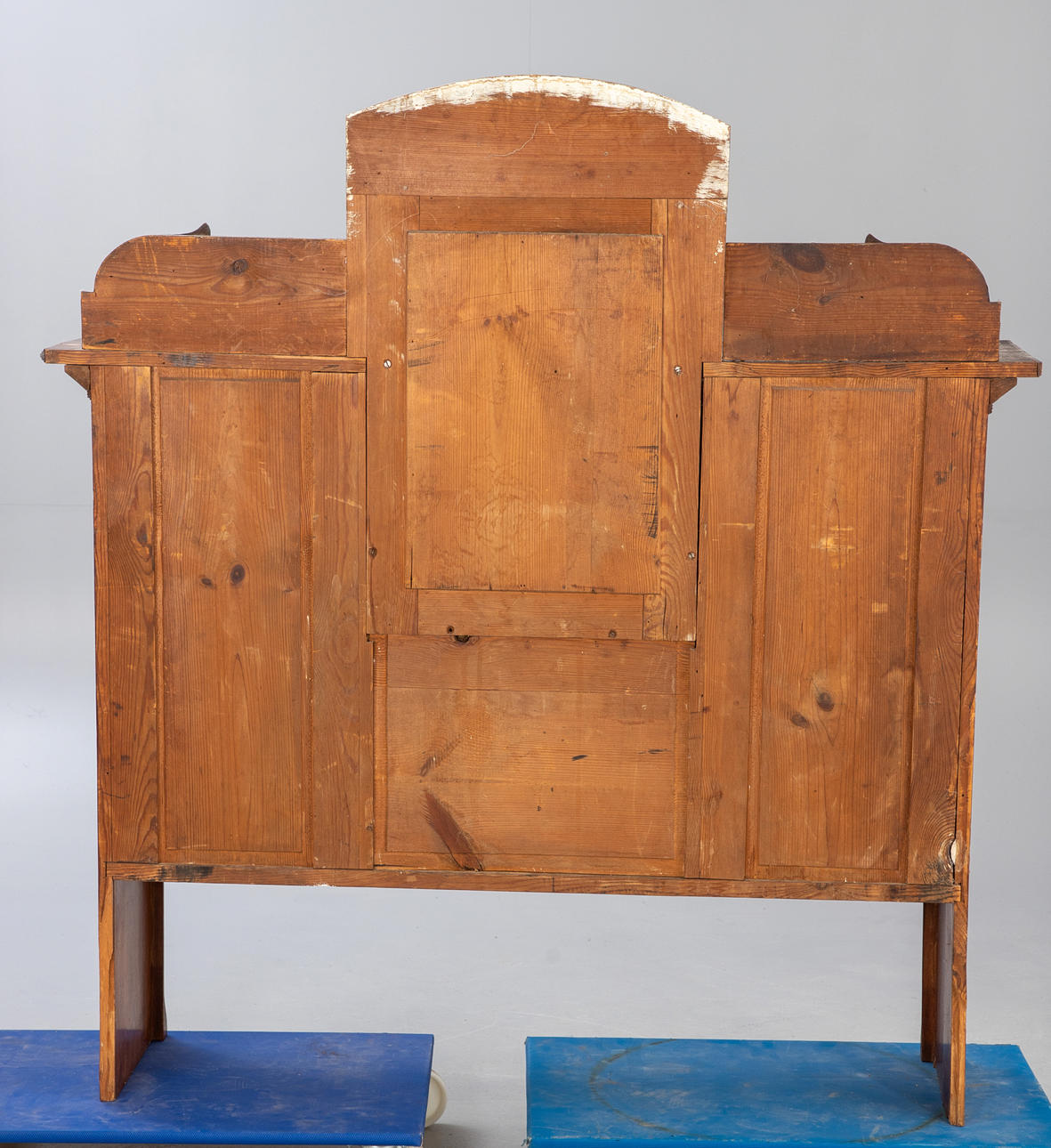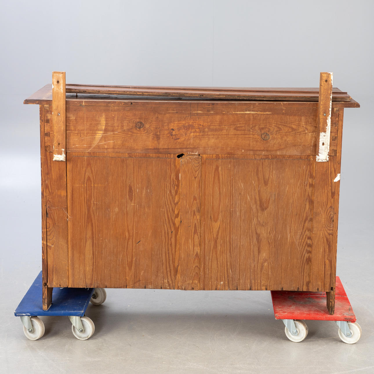 Gebrauchsspuren, stellenweise Furnierschäden, Wasserflecken, ausgeblichene Partien, Fehlstellen und Defekte.