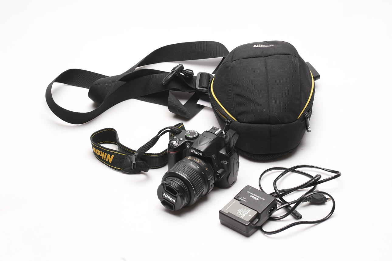 KAMERA, Nikon D3000 mit Ladegerät und Objektiv.