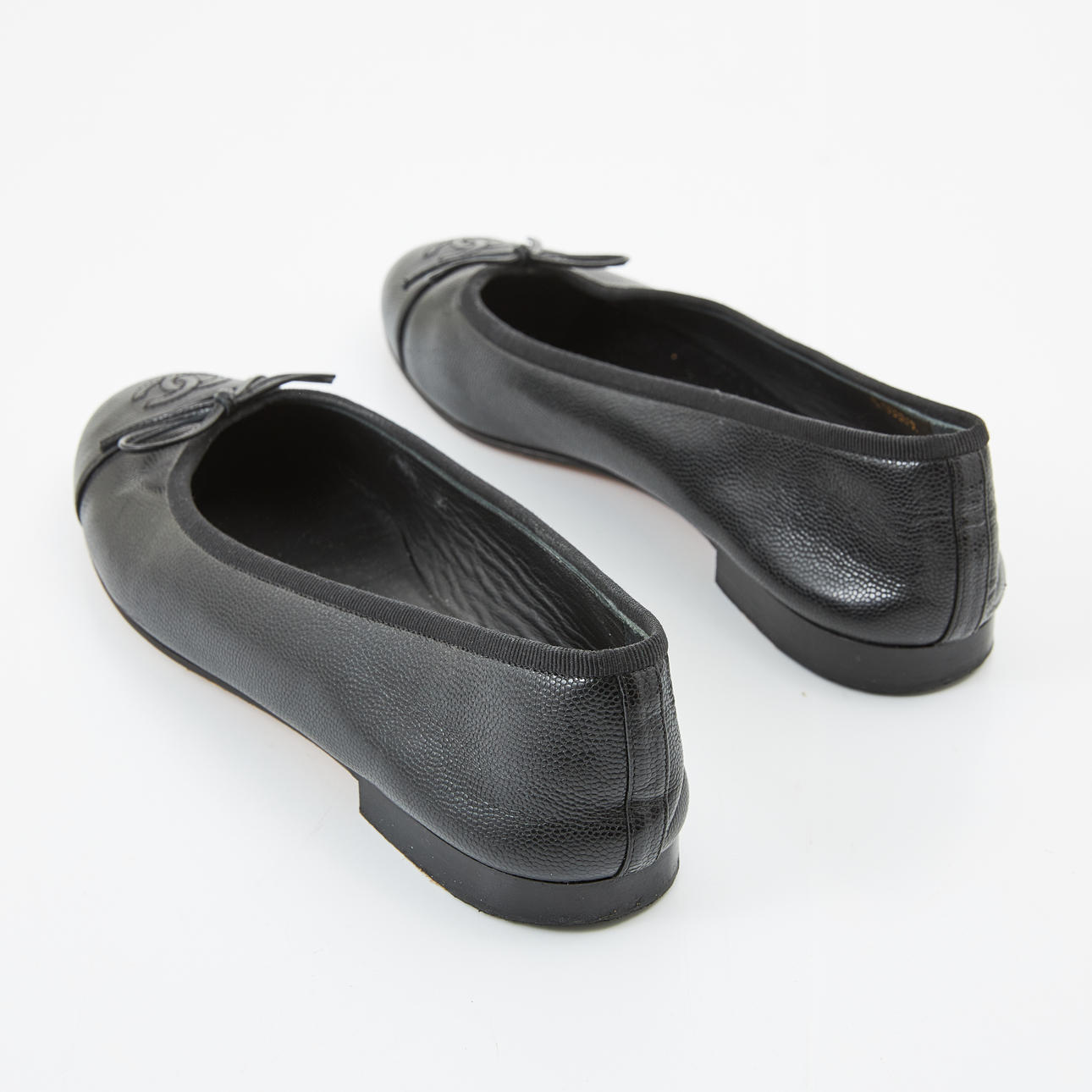 Aus schwarzem Kaviarleder, Zehenkappe mit Monogramm-Logo, mit Schleife verziertes Oberteil, Aufschrift „CHANEL MADE IN ITALY“, Größe 40, inklusive Schuhbeutel.