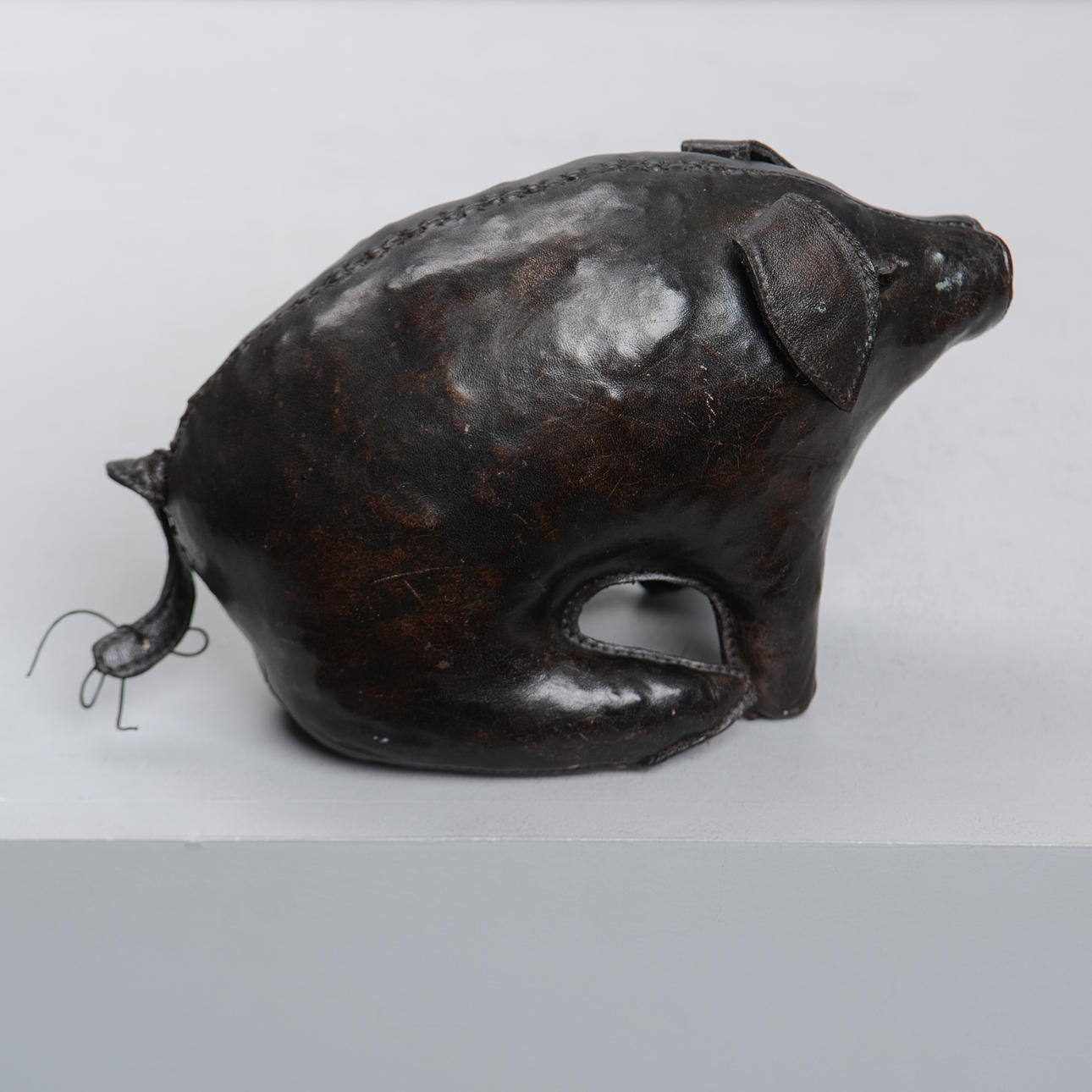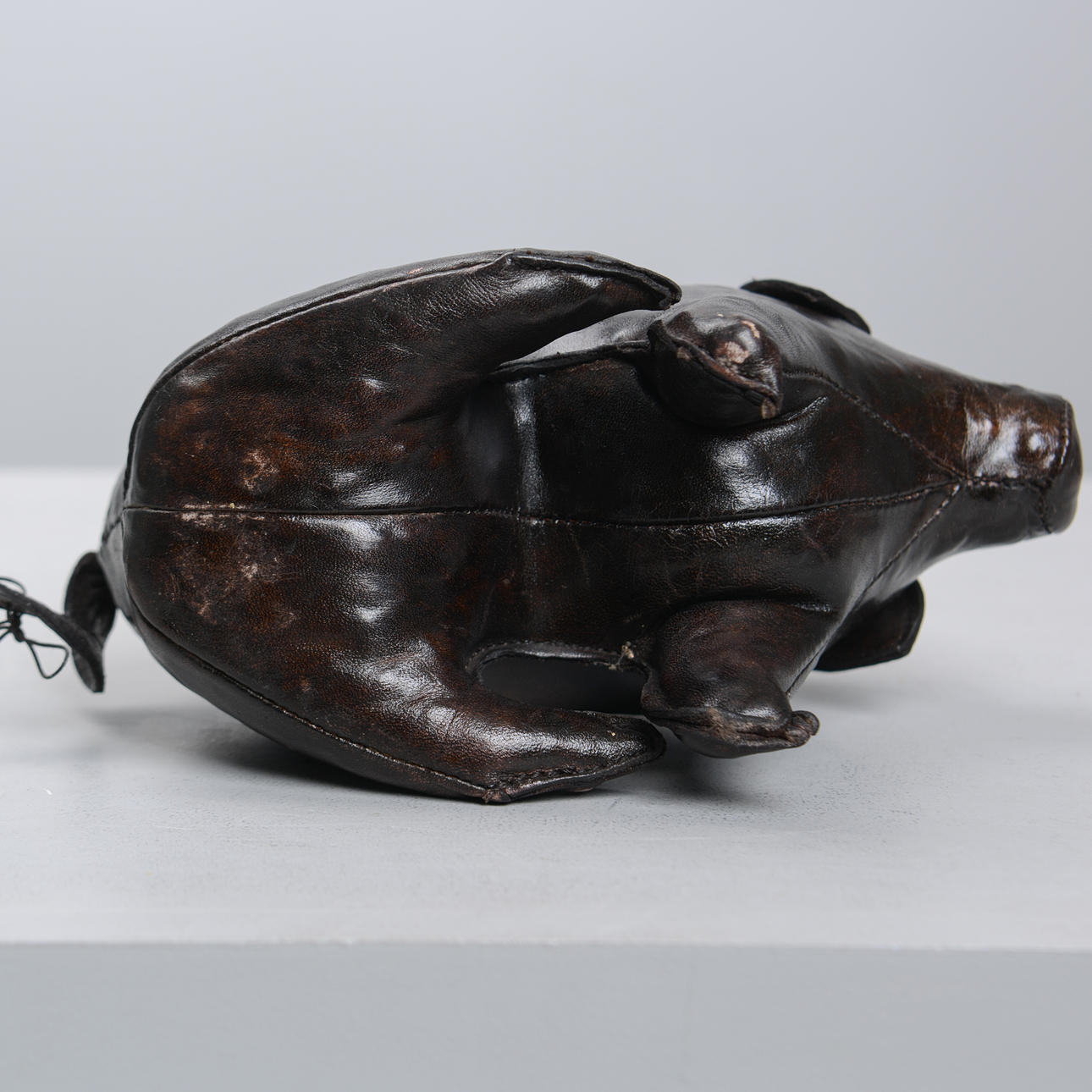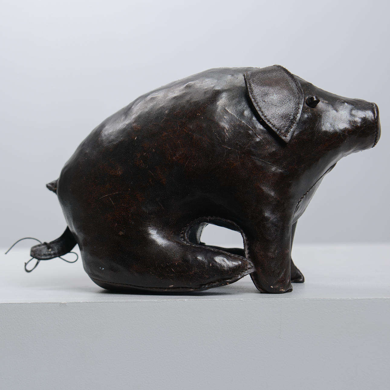 Handgenähte Figur aus braunem Leder in Form eines sitzenden Schweins. Höhe 15, Länge ca. 23 cm.
