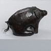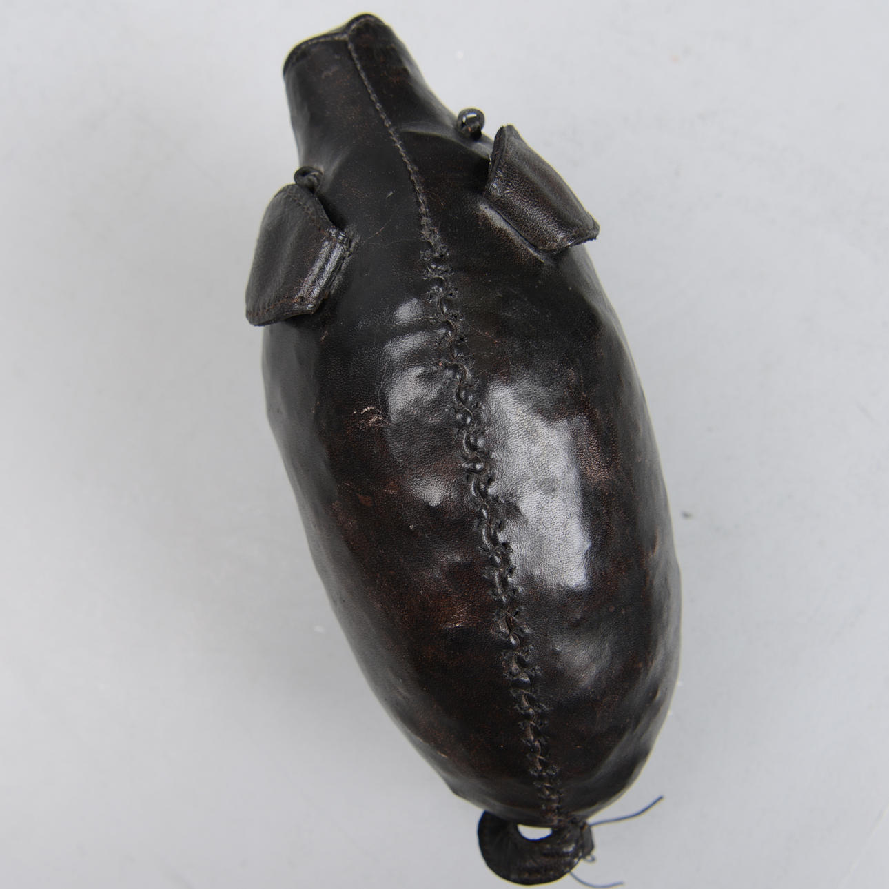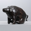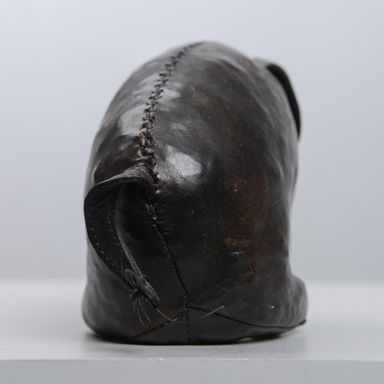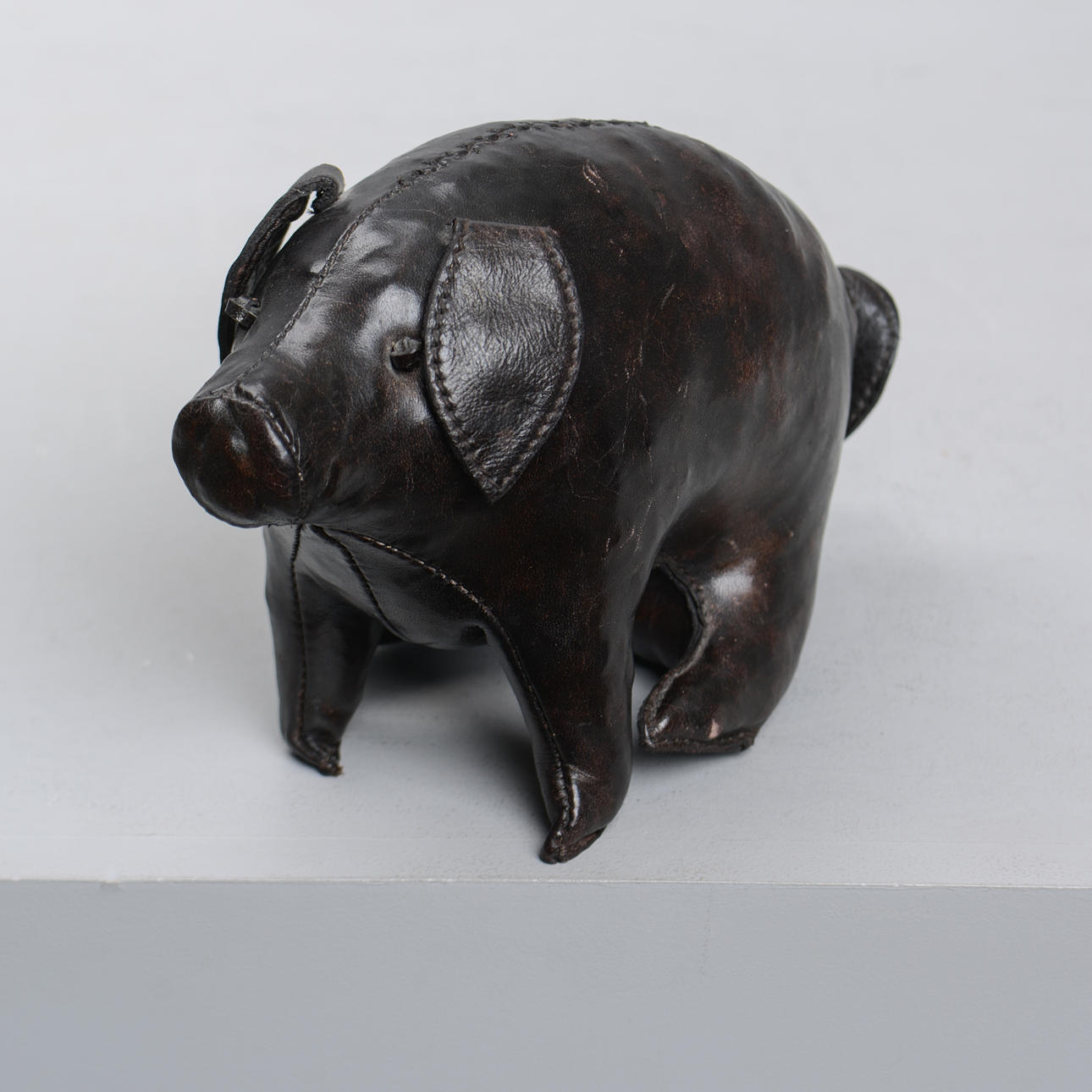 Handgenähte Figur aus braunem Leder in Form eines sitzenden Schweins. Höhe 15, Länge ca. 23 cm.