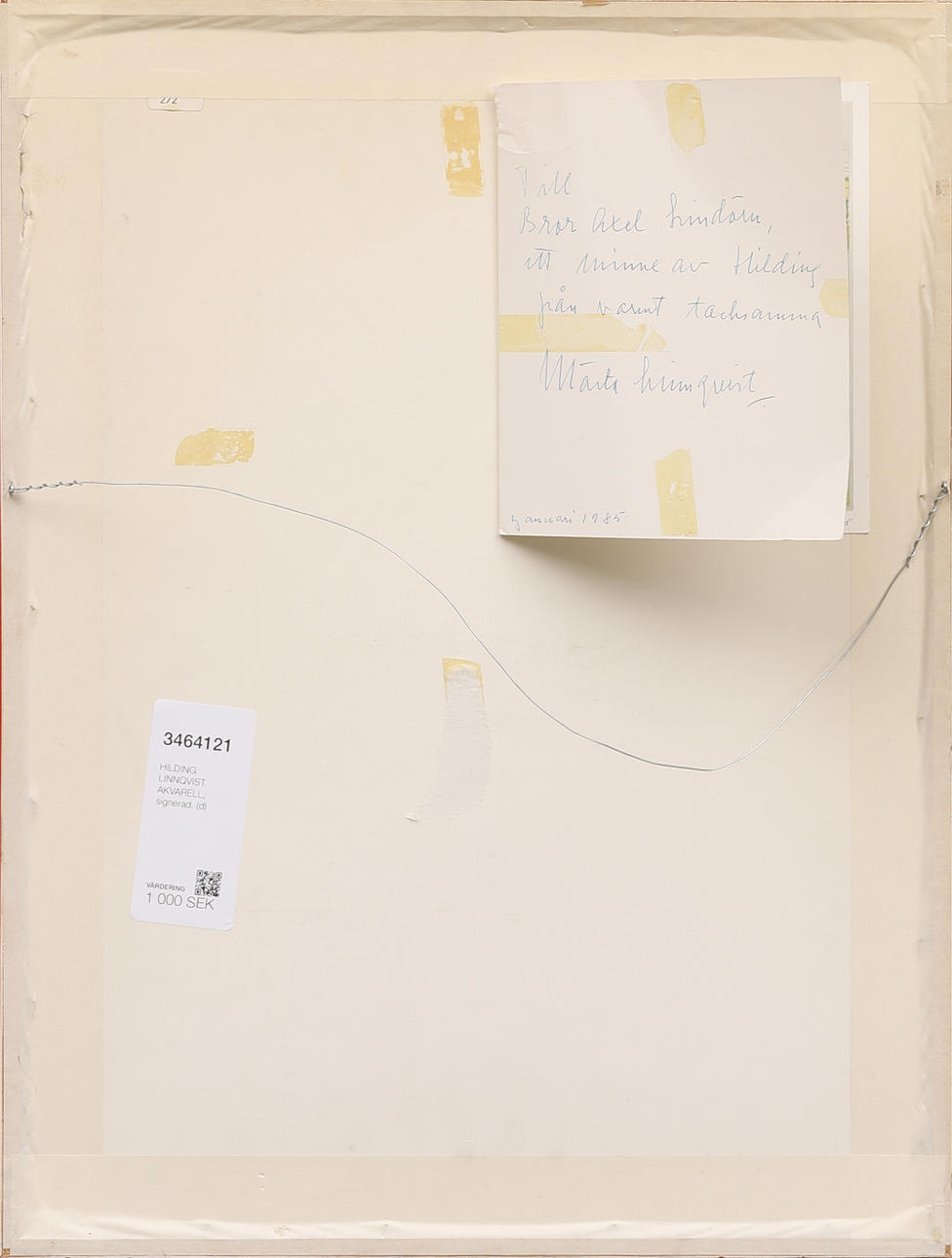 Auf der Rückseite eine Geschenkkarte der Frau des Künstlers, Märta Linnqvist, an Bror Axel Lindörn, Pastor der Gemeinde Danderyd.