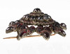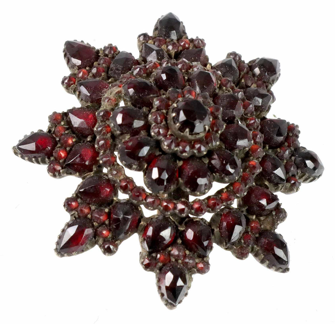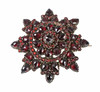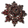 in Form eines 8-zackigen Stern, besetzt mit facettierten, blutroten, böhmischen Granaten, Rückseite ist eine Nadel angebracht.