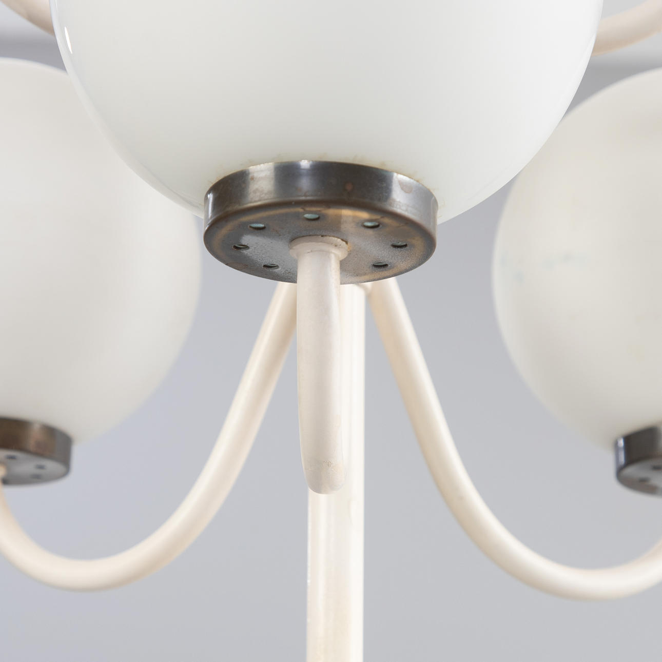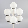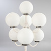 Stehlampe mit 7 Kugeln aus satiniertem Glas und weiß lackierter Halterung. 7 Brennstellen.