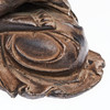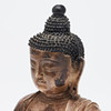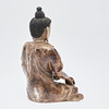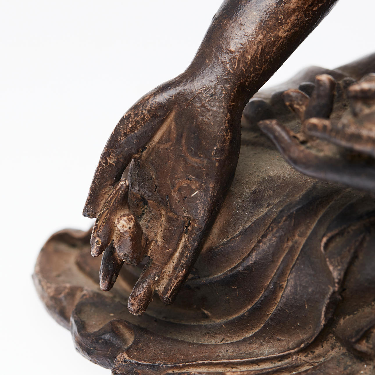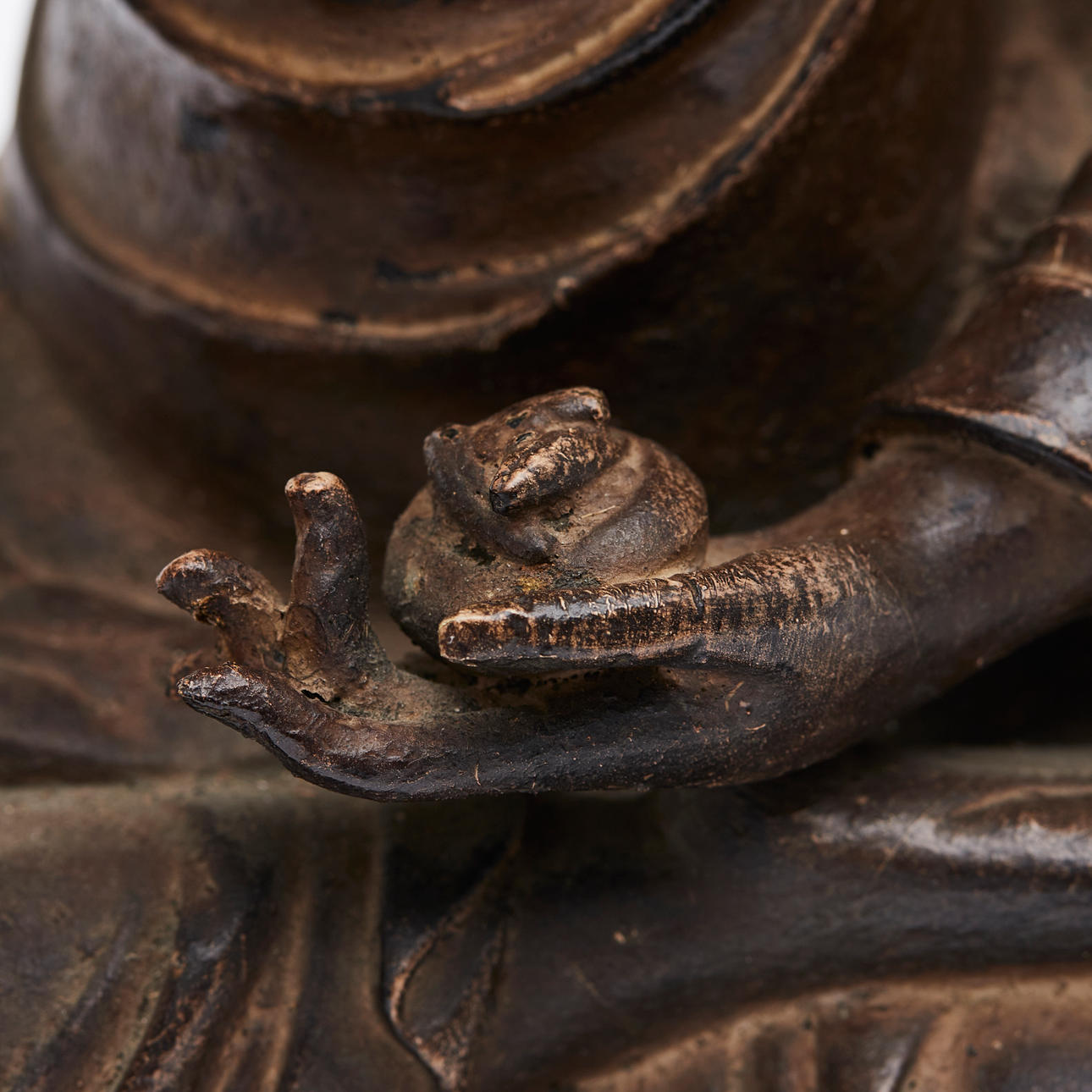Sitzender Buddha aus dunkelbraun patiniertem Messing, in den Händen mit Lotusblüte, H.25,5cm, L.19cm, B.13cm.