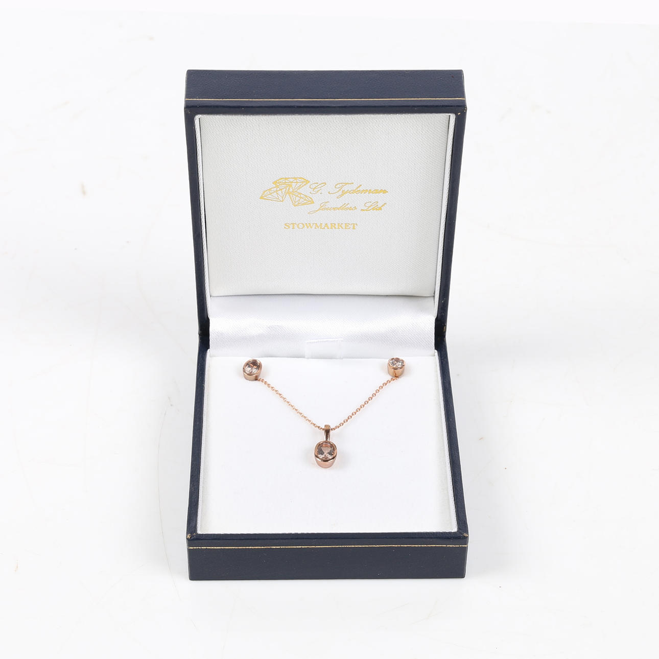 Ein passender Anhänger aus Morganit misst 7 x 5 mm und ist an einer feinen Kette aus 9-karätigem Roségold mit einer Länge von 16—18 Zoll aufgehängt. Bruttogewicht 3,4 g.