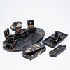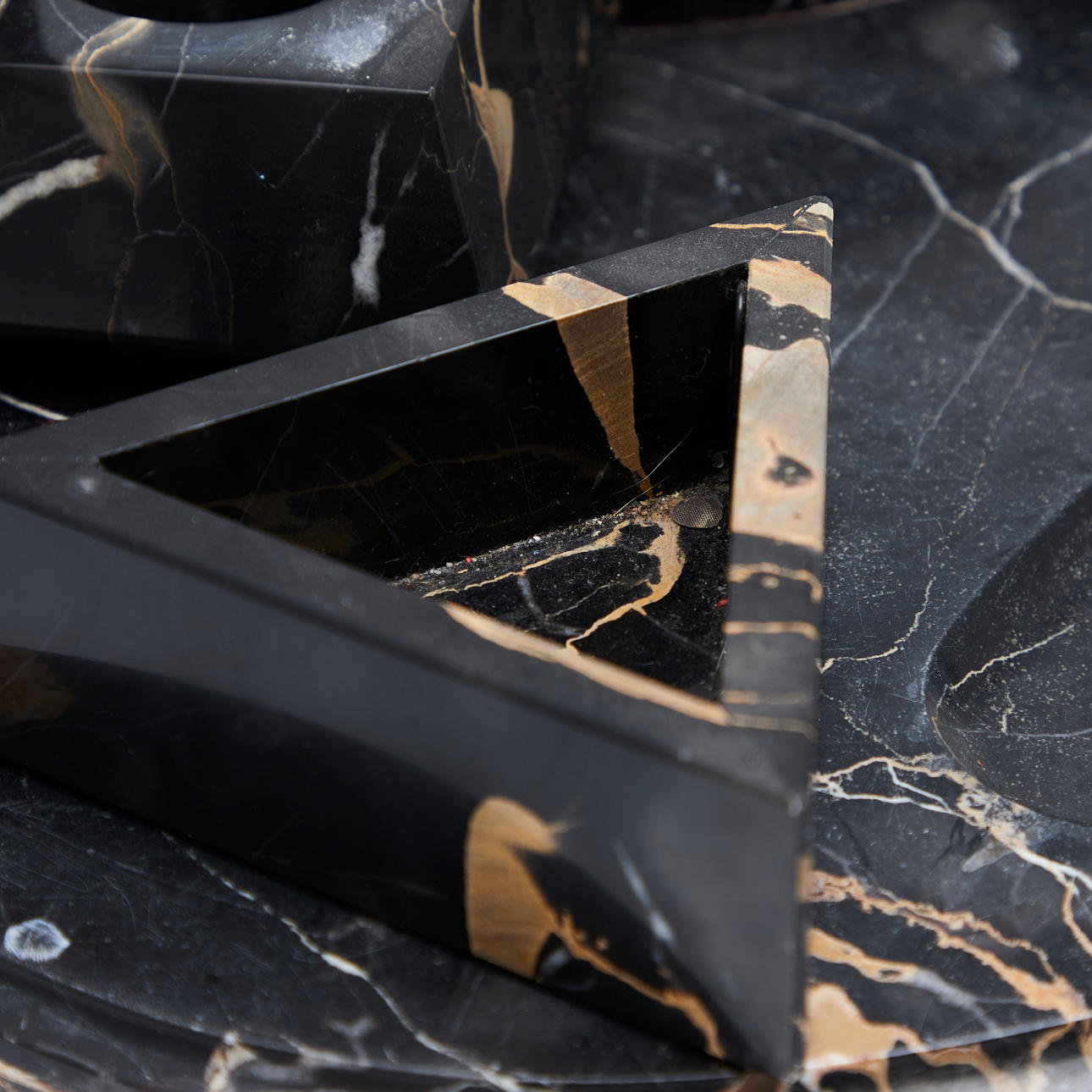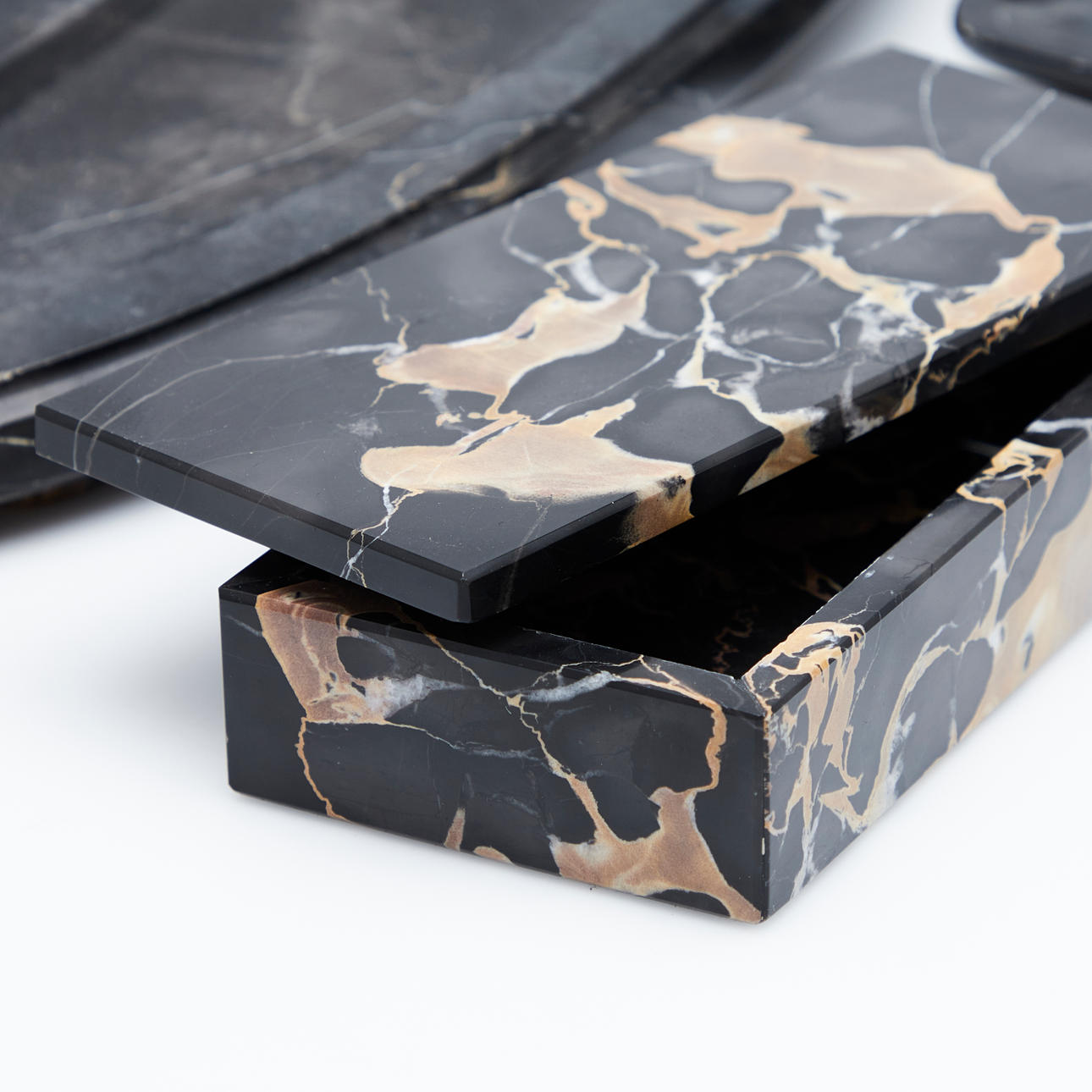 Ovale Schreibtischgarnitur aus schwarzem Marmor mit brauner und weißer Äderung, mit einem fest montierten, klappbaren Behältnis für Tinte mit zwei Einsätzen, anbei mit zwei weiteren Tintenfässern, eines davon mit Glaseinsatz, Tintentrockner, trigonaler Schale, Stiftablage sowie Tablett ausgestattet, unterseitig teilweise mit Filzgleitern versehen, H.2-9,5cm, B.8,5-50cm, T.7-32cm. (8).